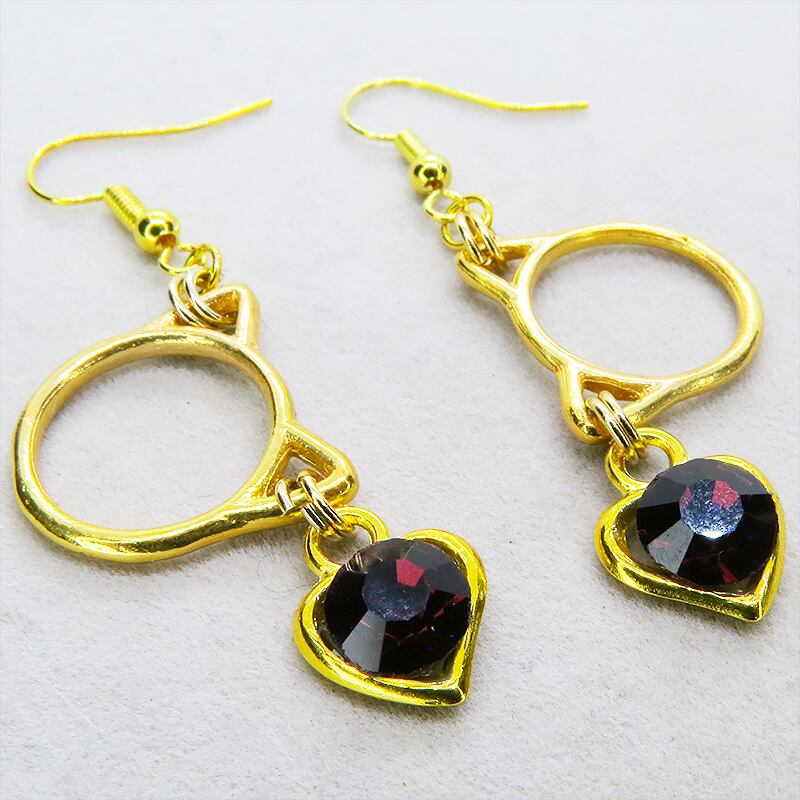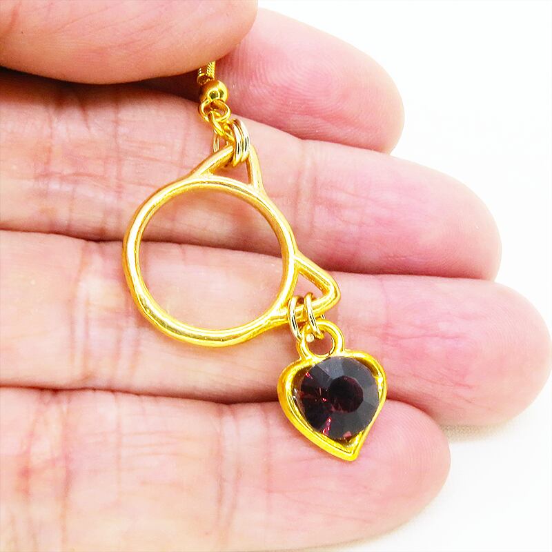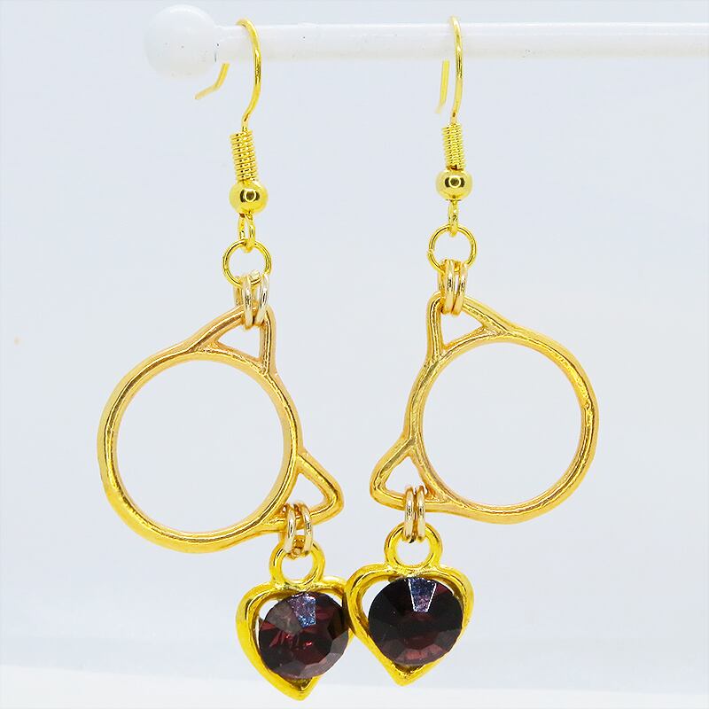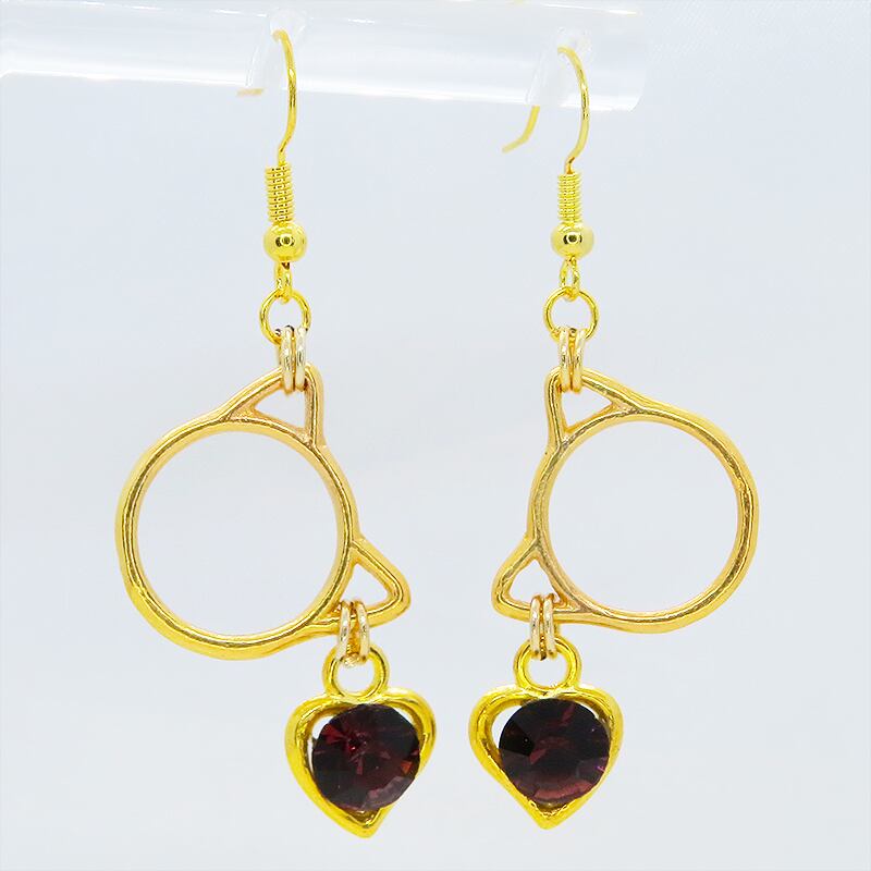 ゴールドカラーの猫のフェイスフレームに、ガーネットカラーのクリスタルガラスを埋め込んだハートモチーフが揺れ、大人可愛いデザインが魅力です