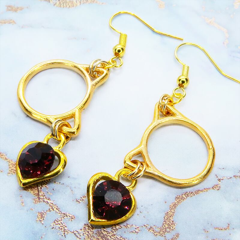 そのフレームから美しいガーネットカラーのクリスタルガラスを埋め込んだハートモチーフが吊り下げられています