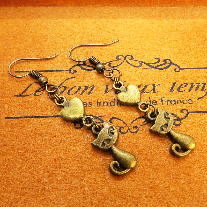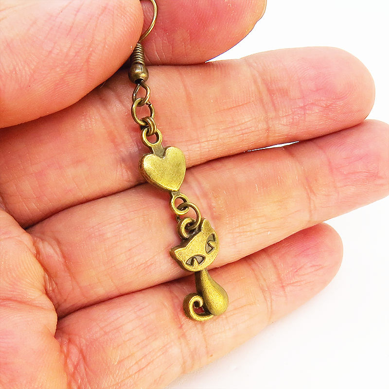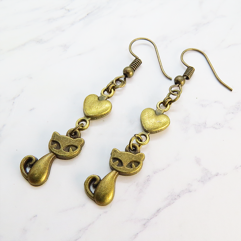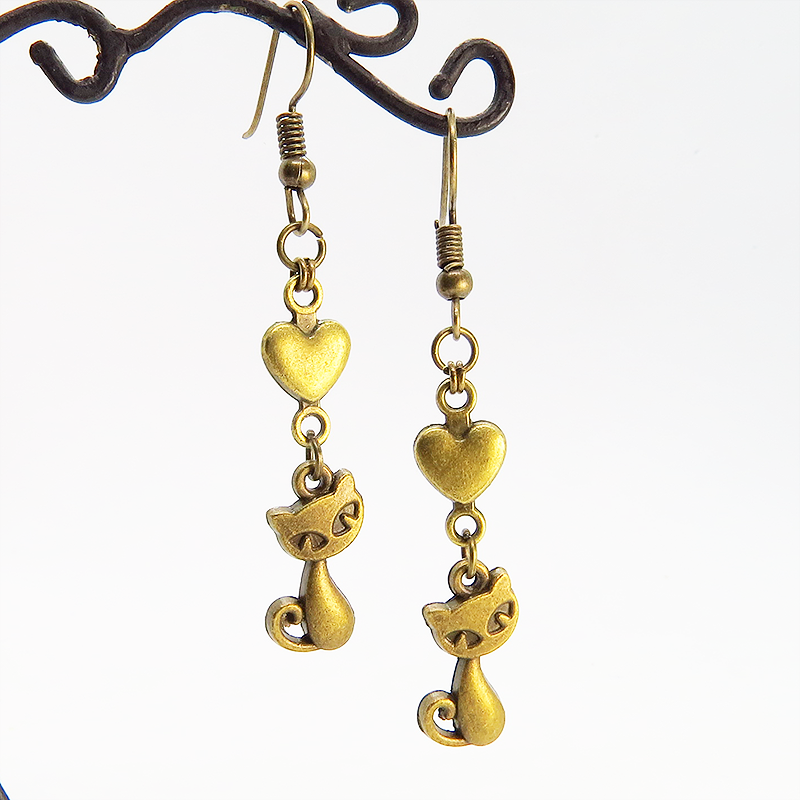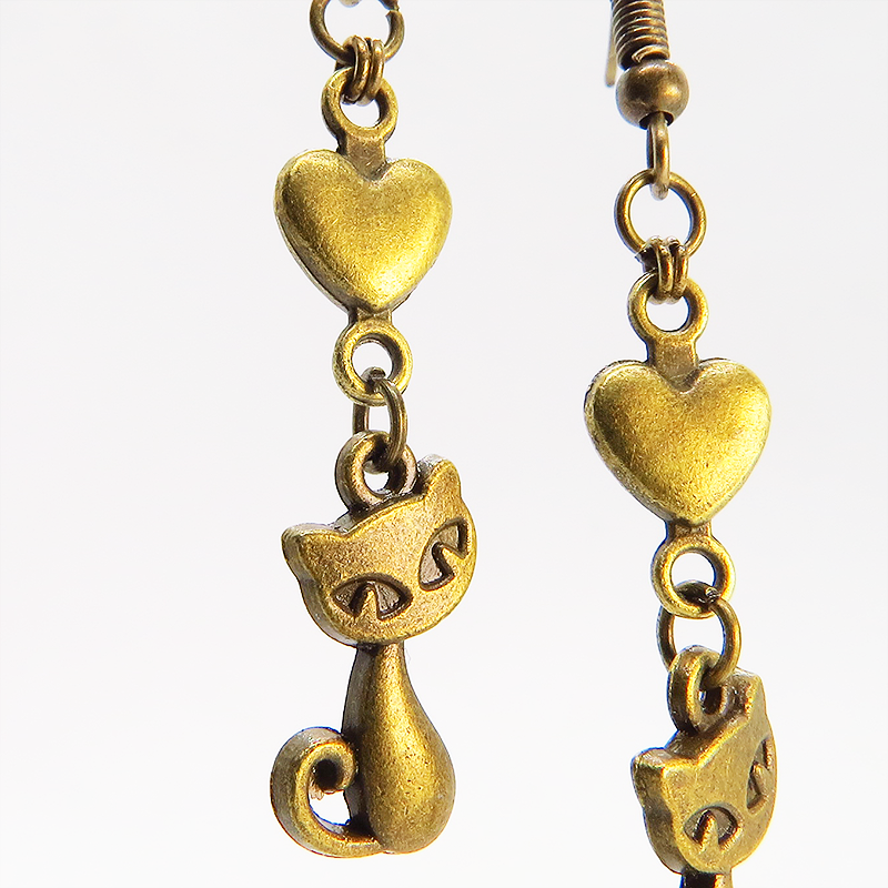 アンティークゴールド(真鍮古美)で統一した猫とハートの組合せたシンプルなピアスです