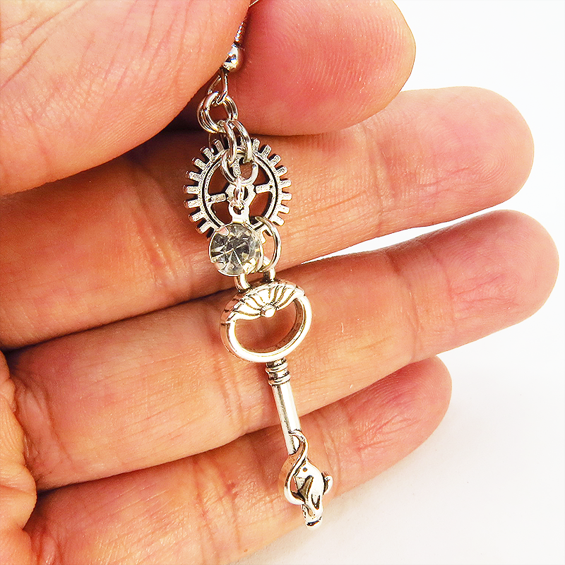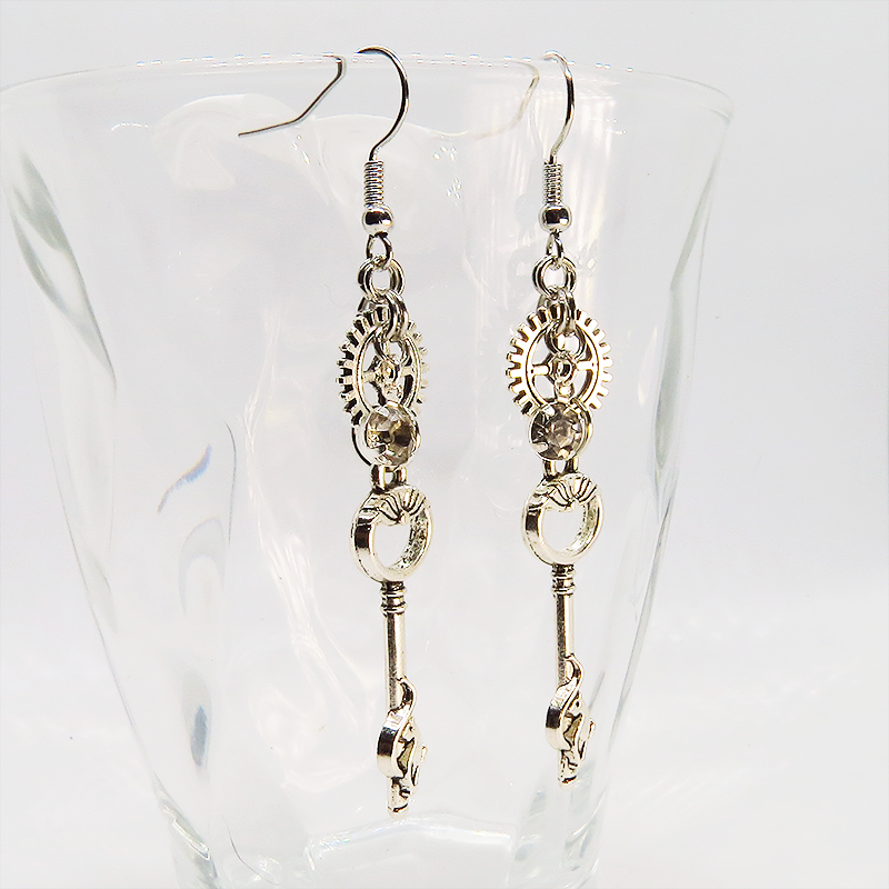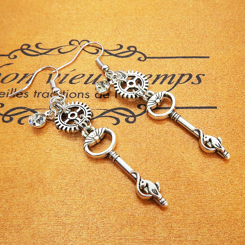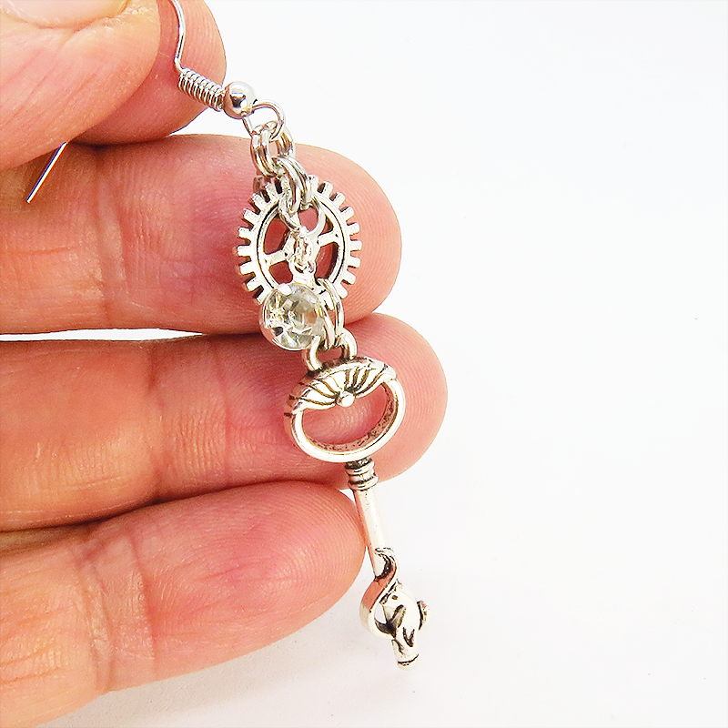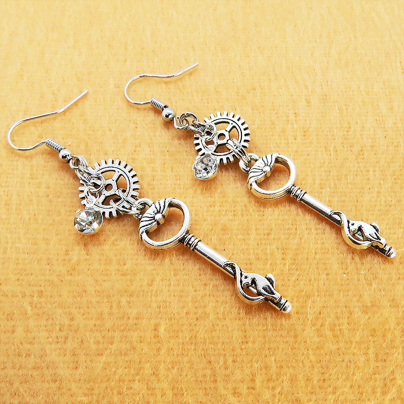 アンティークシルバーの鍵に座る猫モチーフと歯車を組み合わせたスチームパン風のピアスです