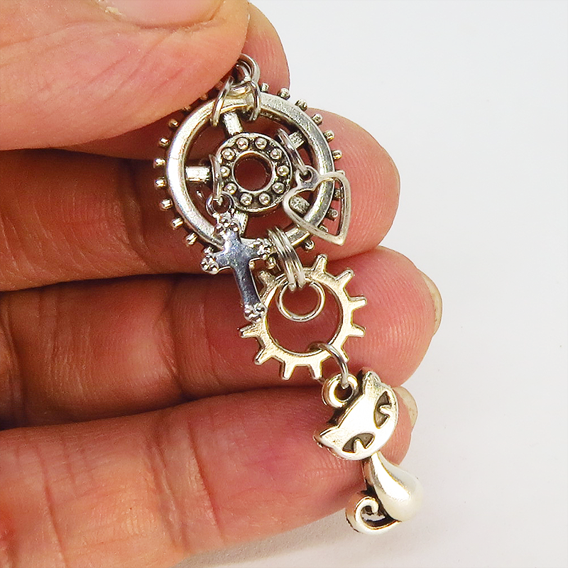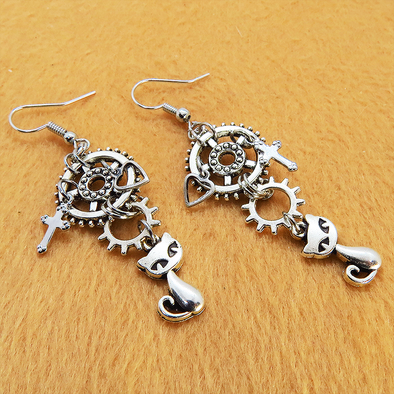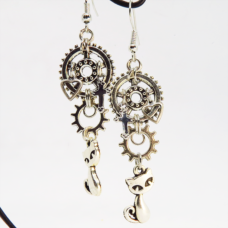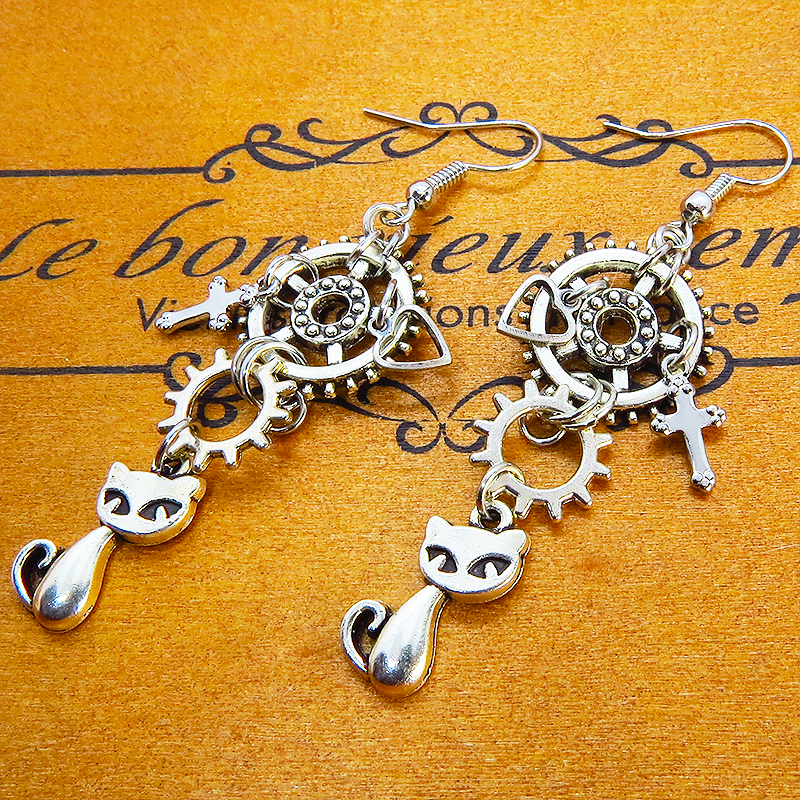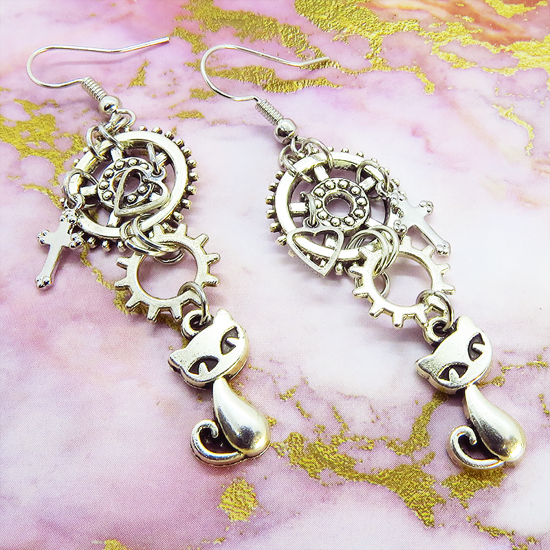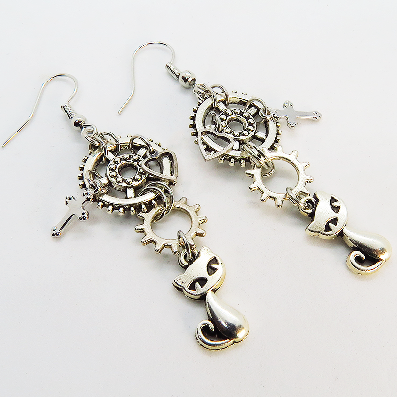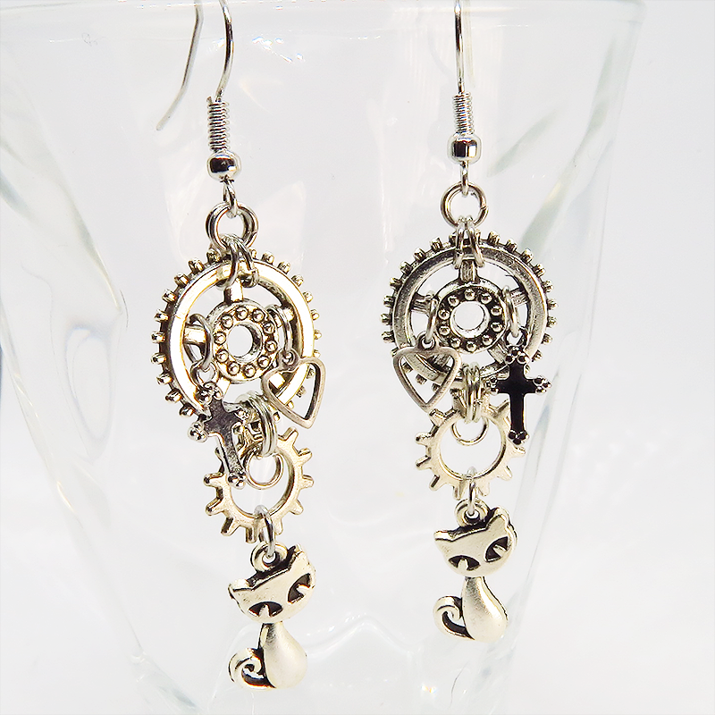 可愛い猫のモチーフと大小異なる歯車のモチーフを組合せたスチームパンク風のピアスです