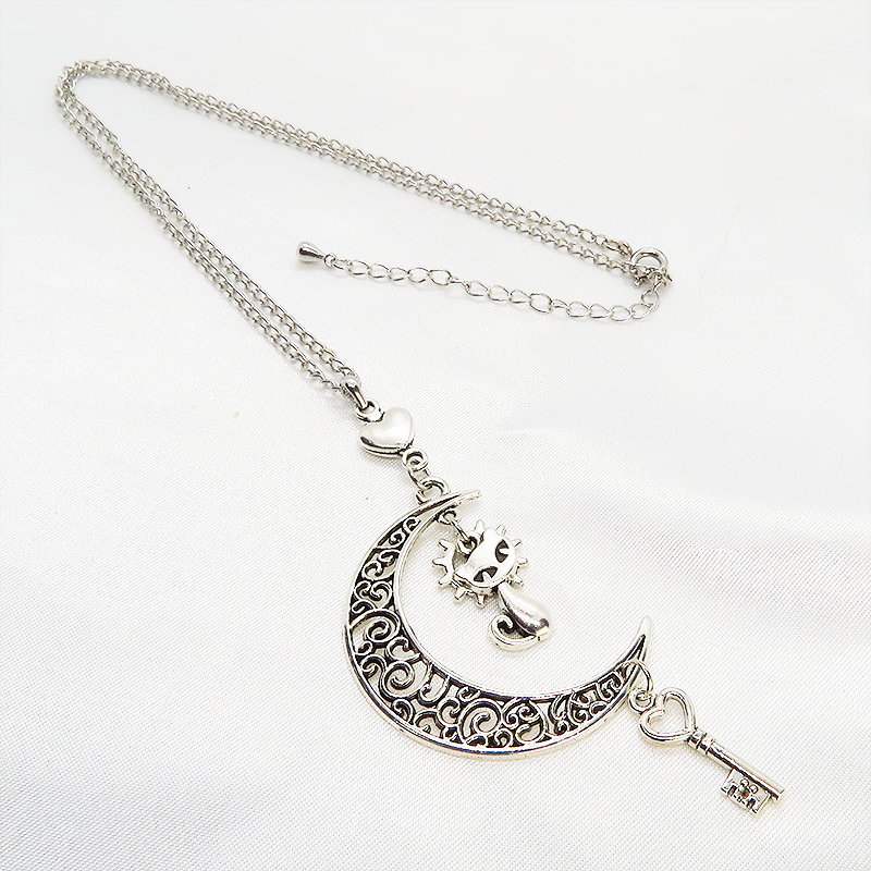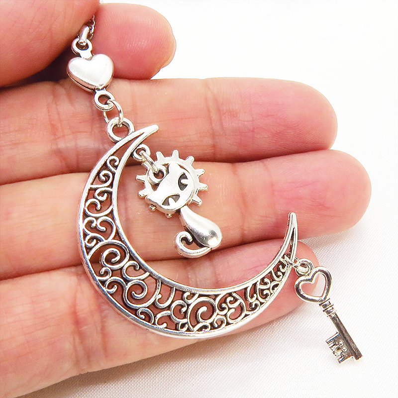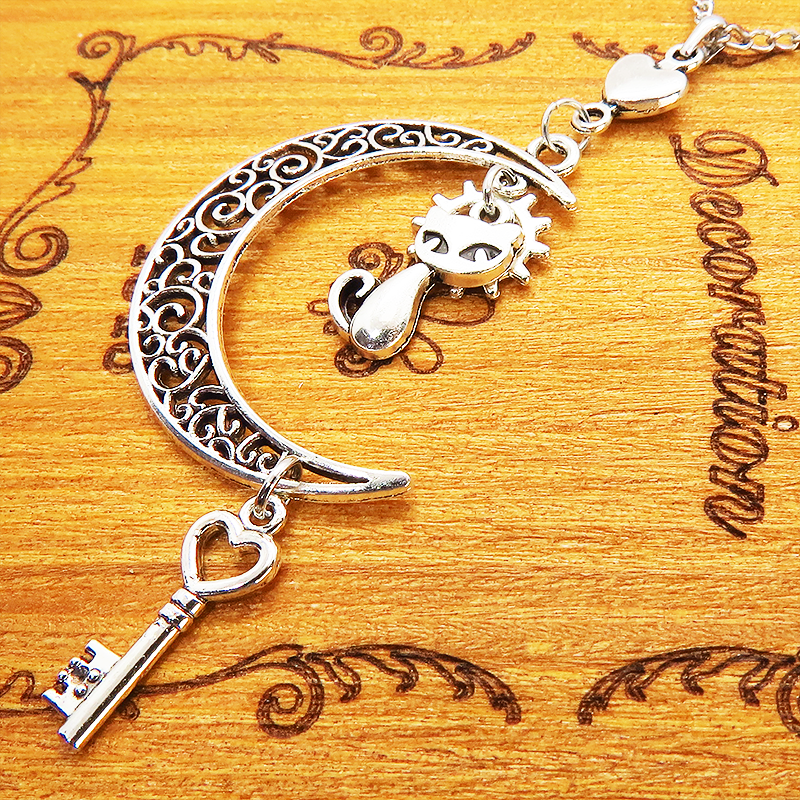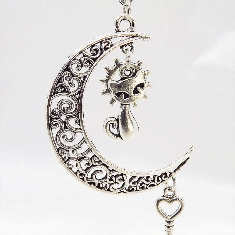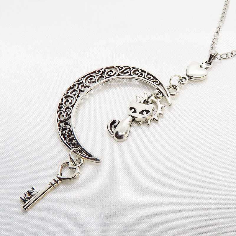 アラベスク調の透かし模様の入ったおしゃれな三日月に猫モチーフを吊り下げたネックレスです