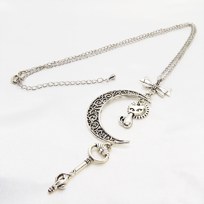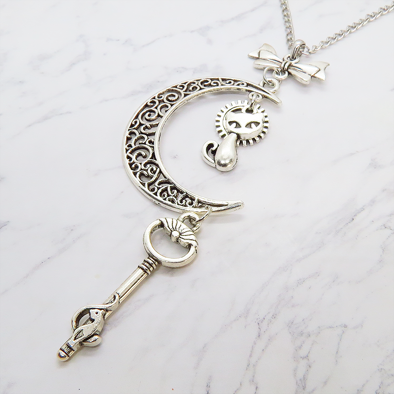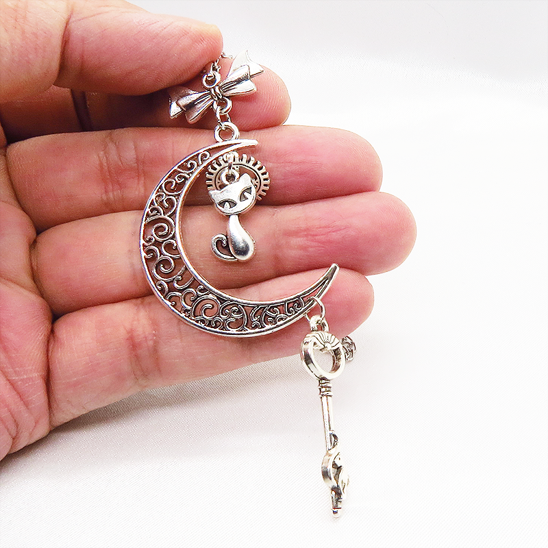 透かし模様の入ったオシャレな三日月と可愛い猫のモチーフに、猫つきの鍵チャームをプラスしてファンタジックなイメージに仕上げています