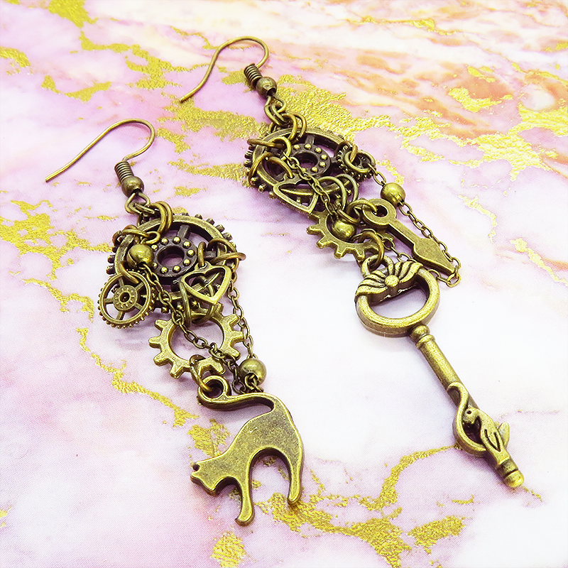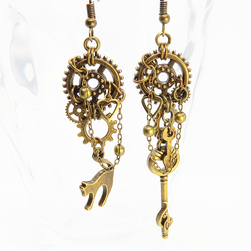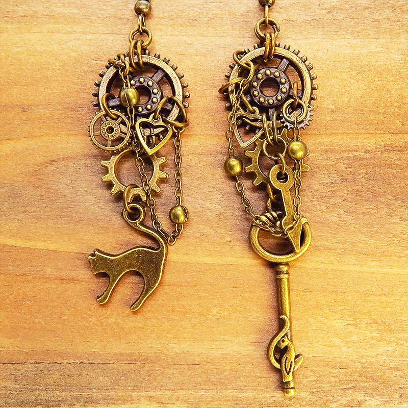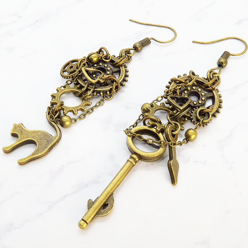 猫と歯車・ギアを組み合わせたアシンメトリーピアスです
