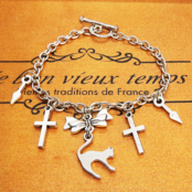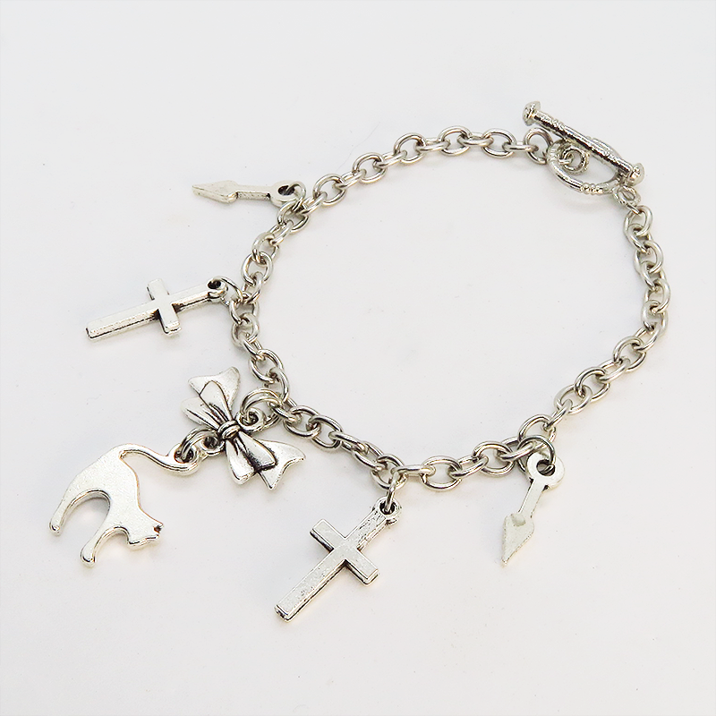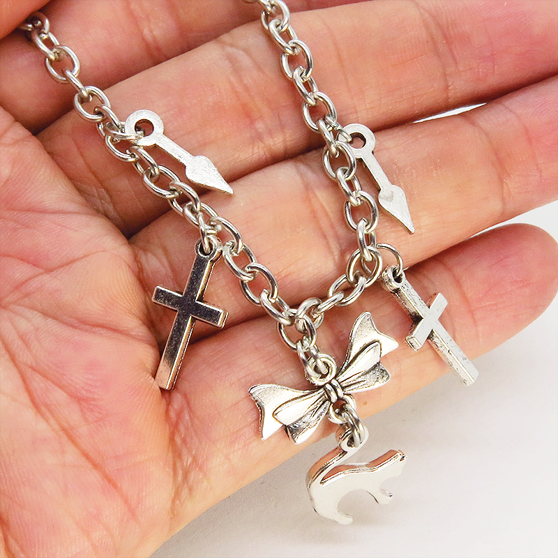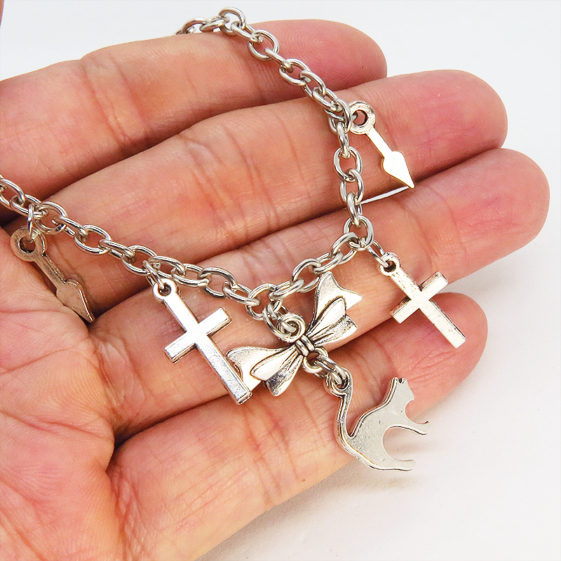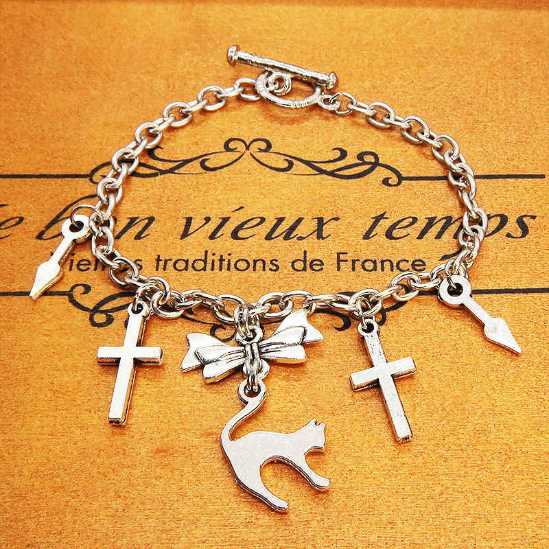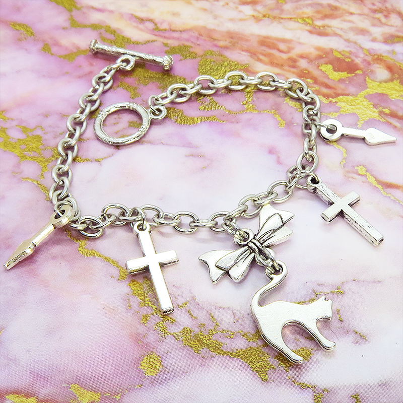 猫、リボン、ロザリオ、時計の針という、異なるモチーフを組み合わせた、華やかで物語性のあるブレスレット