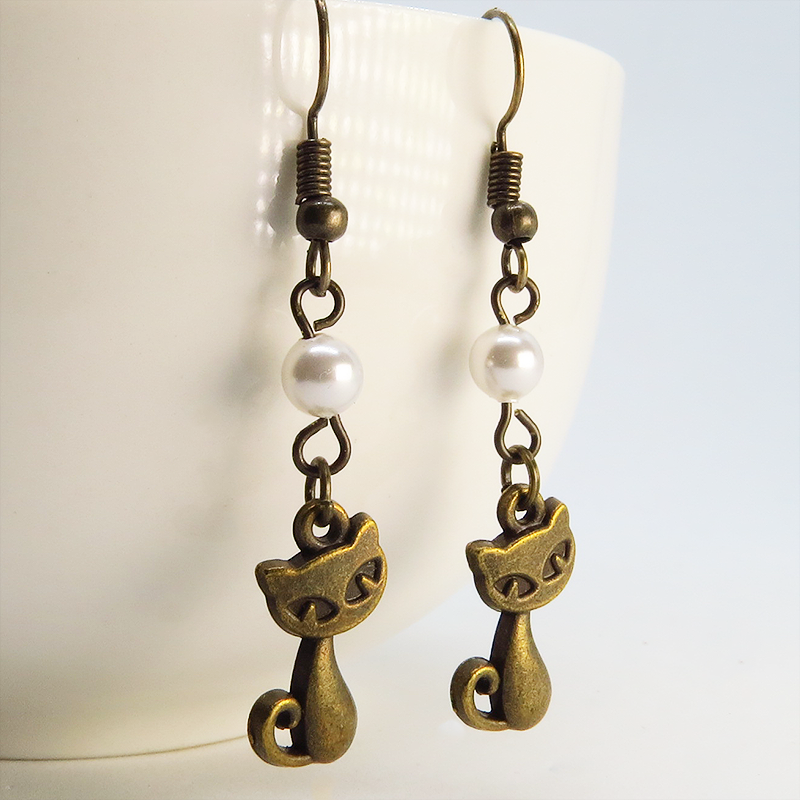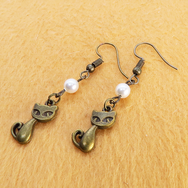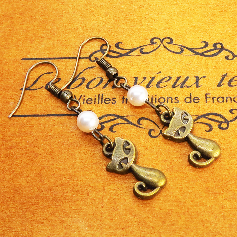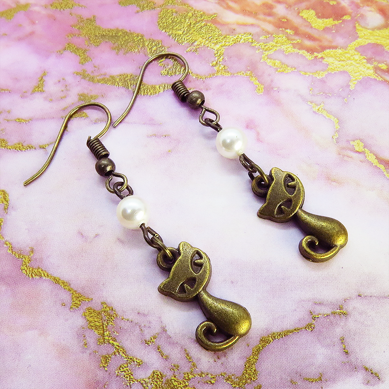 アンティークゴールドの猫モチーフとスワロフスキーパール(クリスタルホワイト)の大人可愛いピアスです