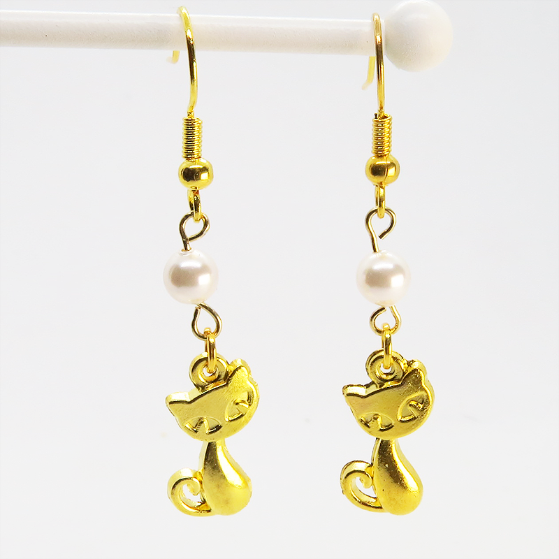 ゴールドカラーの猫モチーフとスワロフスキーパール(クリスタルホワイト)の大人可愛いピアスです