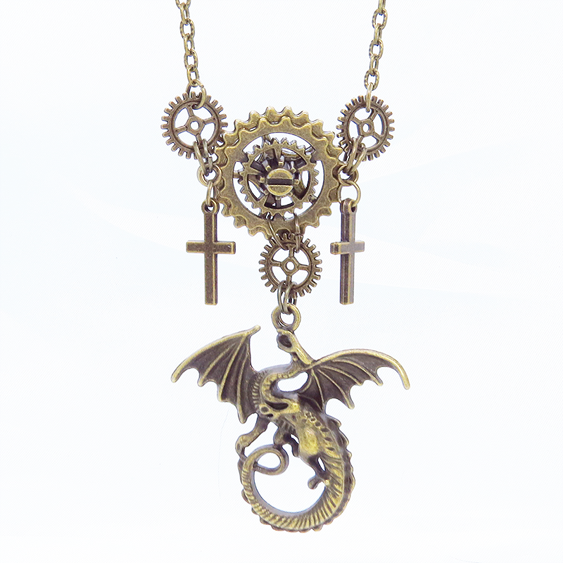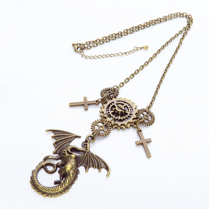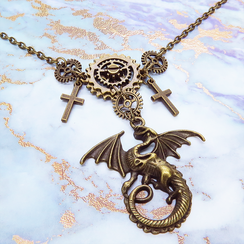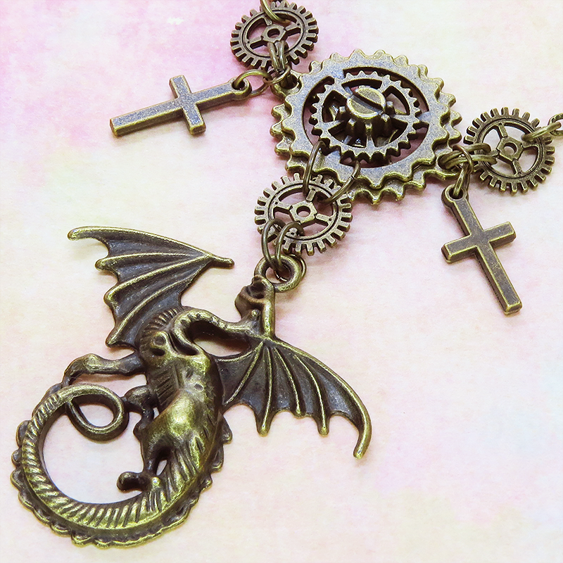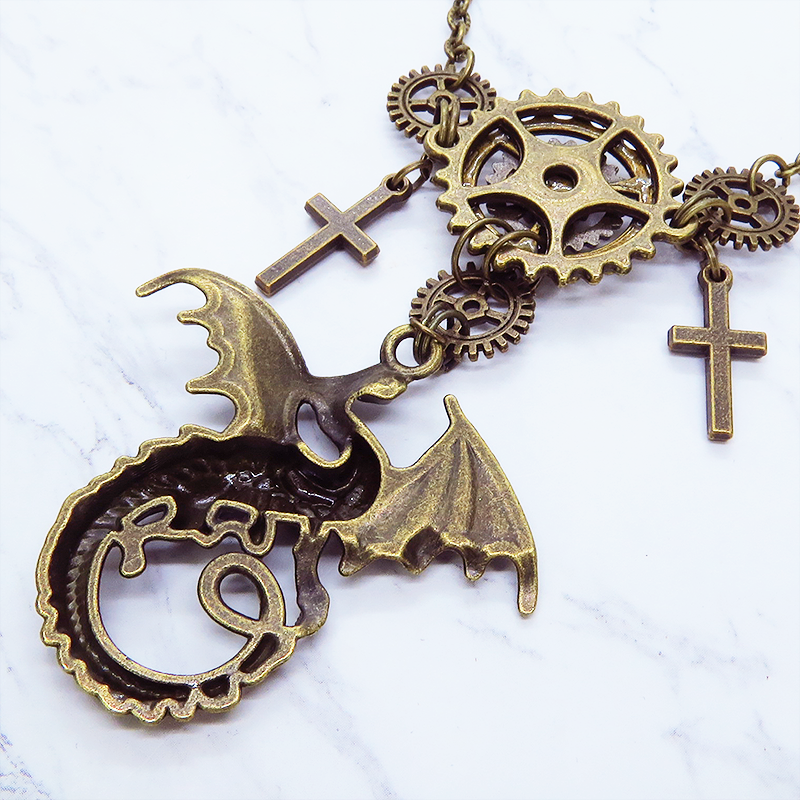 スチームパンク風のアンティークカラー(金古美色)のドラゴンと歯車のネックレスです