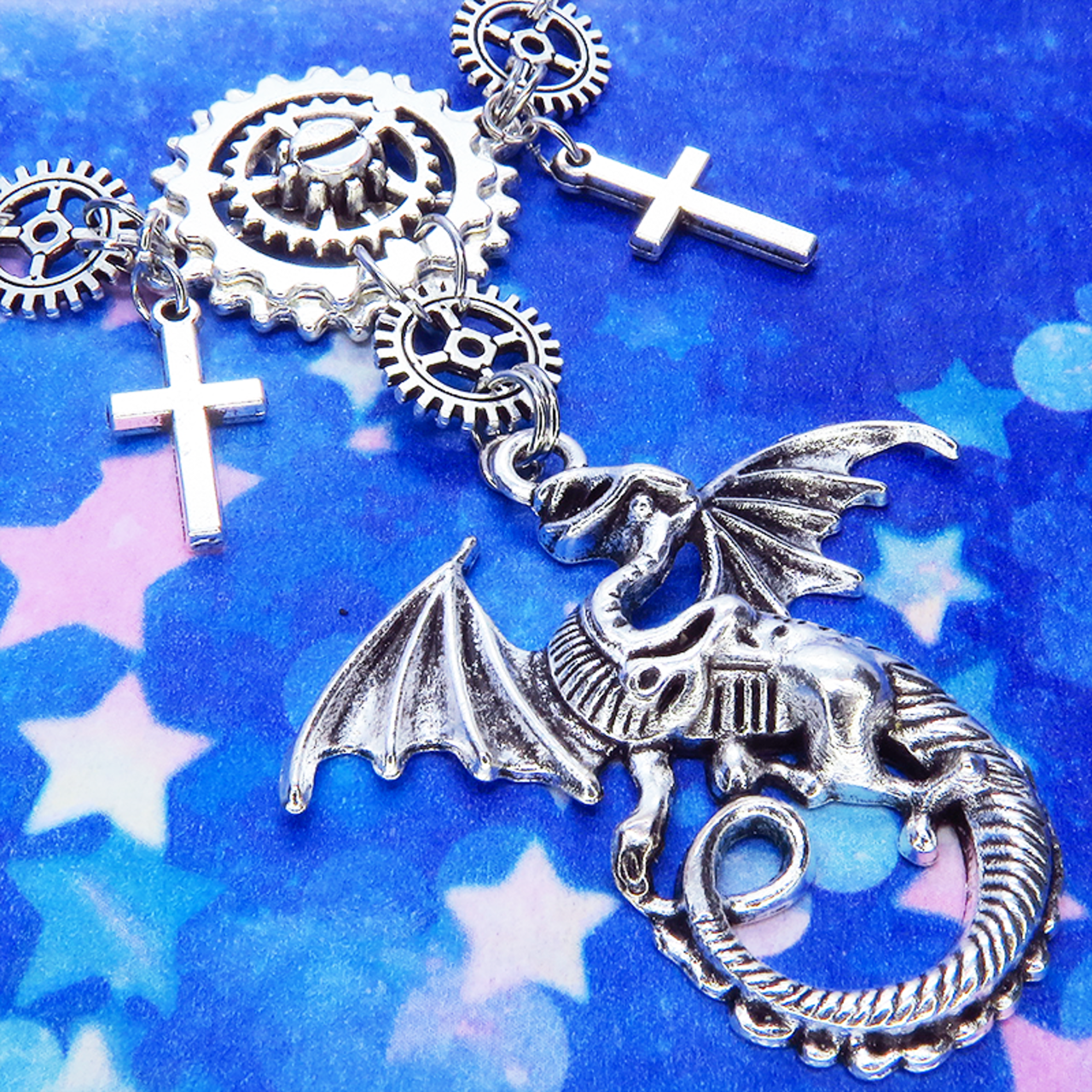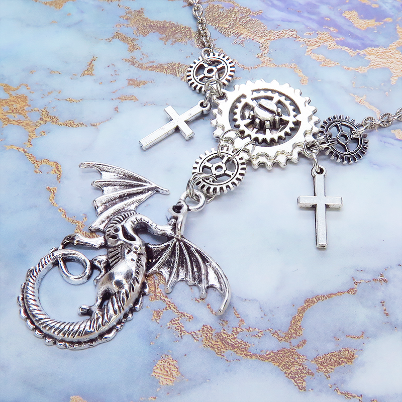 スチームパンク風のアンティークシルバー(銀古美色)のドラゴンと歯車のネックレスです