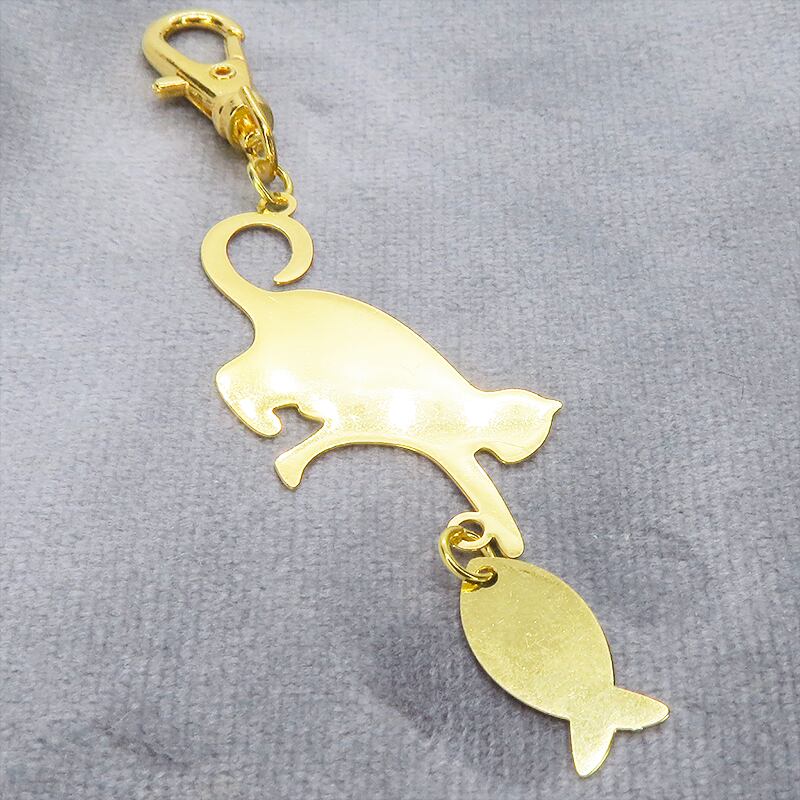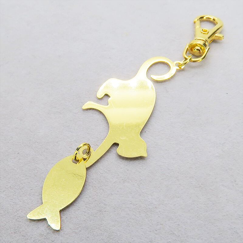 魚を捕まえようとそっと前足を伸ばす猫の姿を、華やかなゴールドカラーのステンレスで表現しました