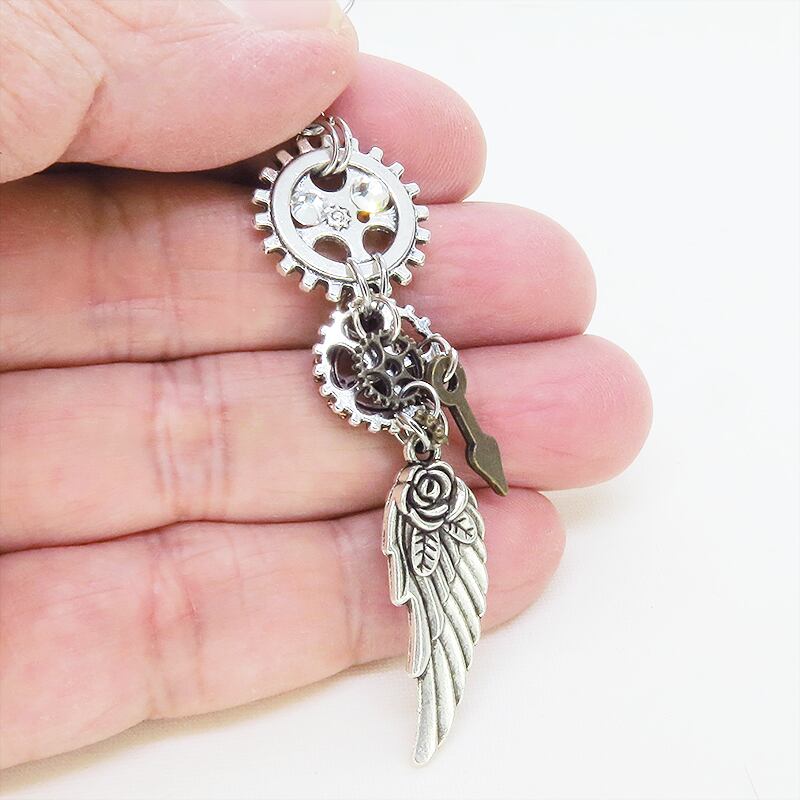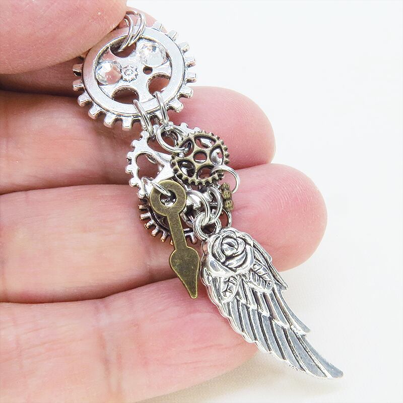 メインはアンティークシルバーカラーで統一しながら、間にアンティークブロンズやアンティークゴールドの小さな歯車パーツを組み込むことで、複雑なメカニカルな奥行きと豊かな色彩のグラデーションが生まれています