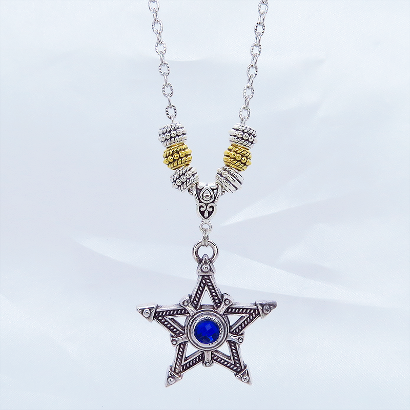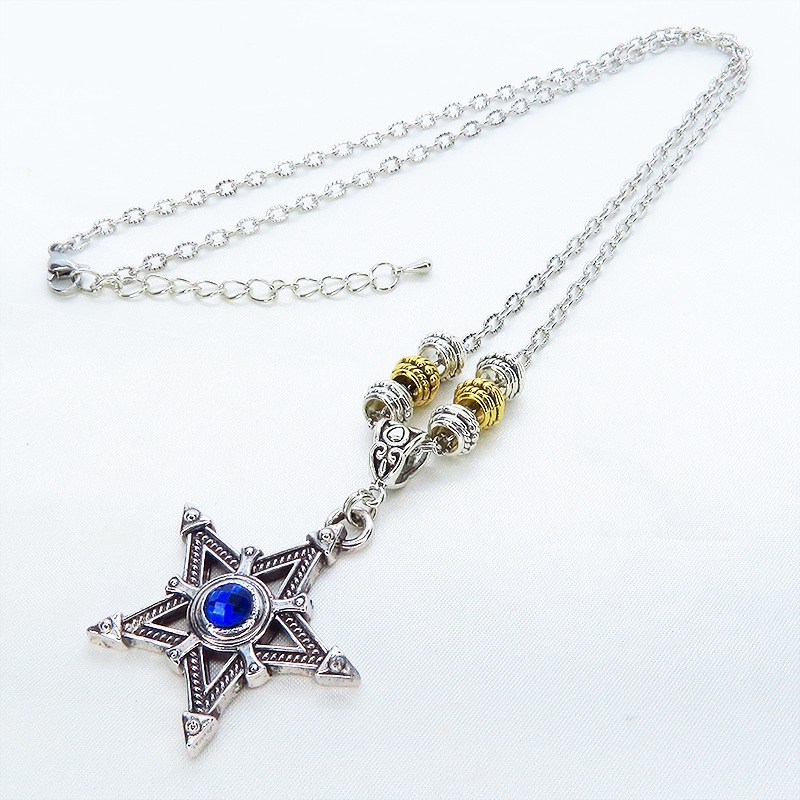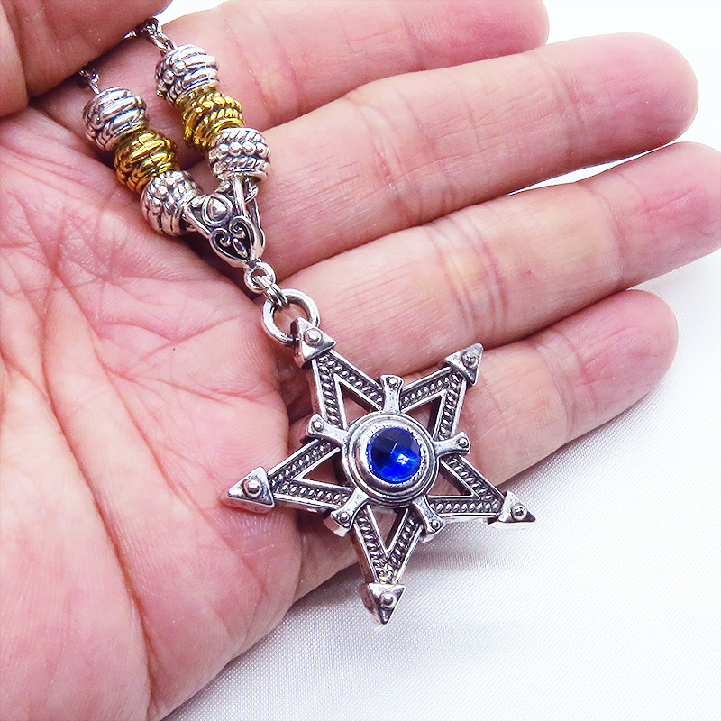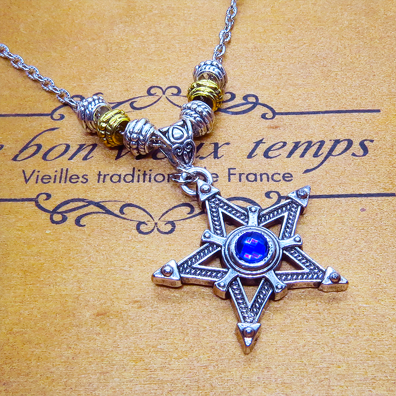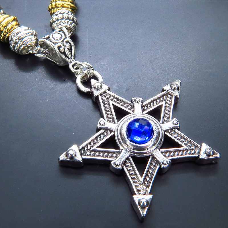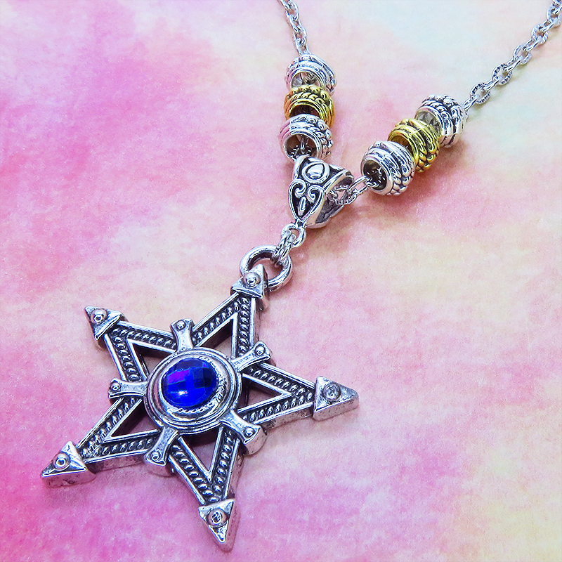 中心に蒼い輝きをもつシルバーカラーのペンタグラム(五芒星)をモチーフとしたペンダント・ネックレスです