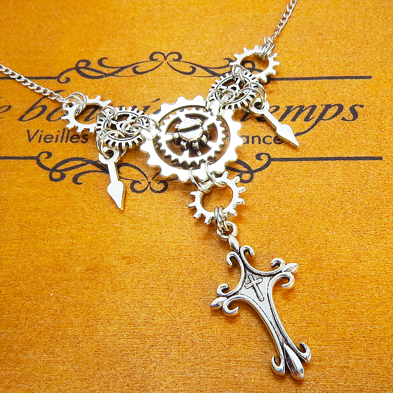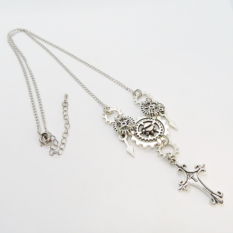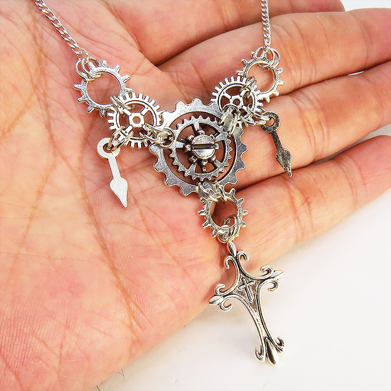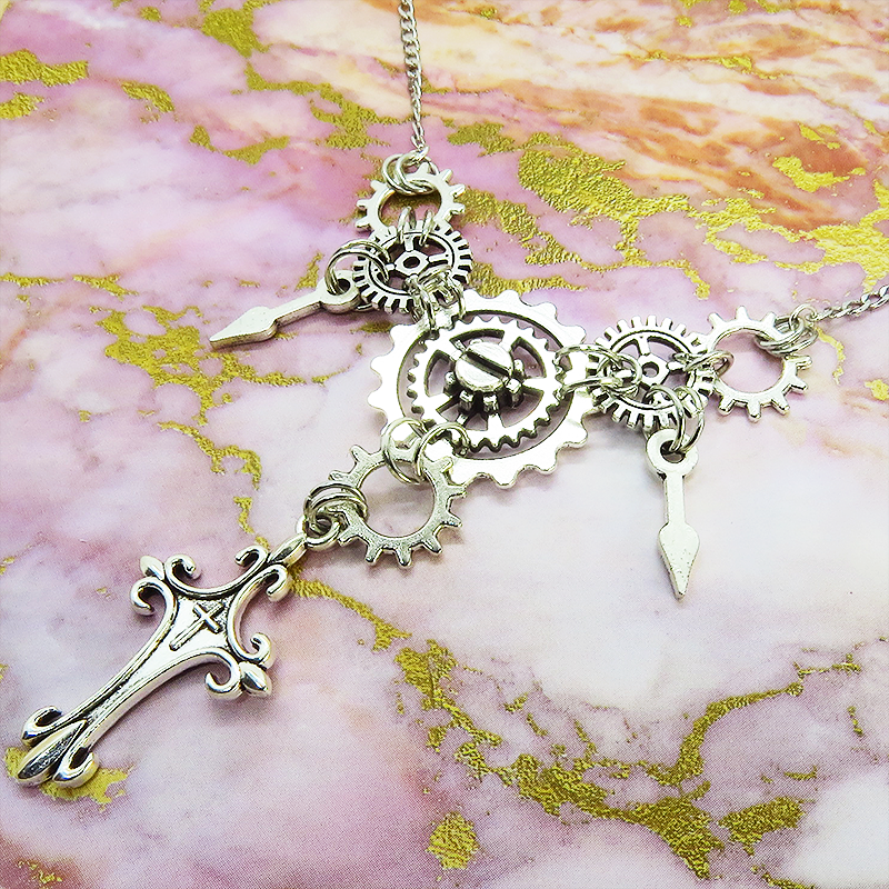 ロザリオ(十字架)や時計の針、歯車・ギアが組み合わさったデザインが、ゴシックな雰囲気も醸し出しています
