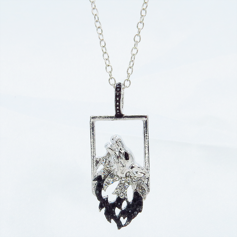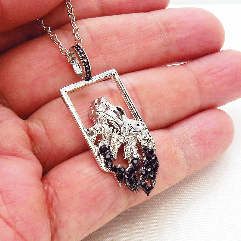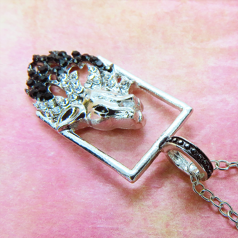 このペンダントはクリアカラーのラインストーンとブラックカラーのラインストーンをモチーフ全体に敷き詰めており、光を浴びるたびにキラキラと多角的に輝きます