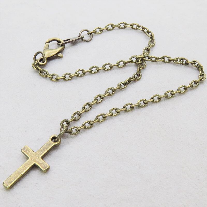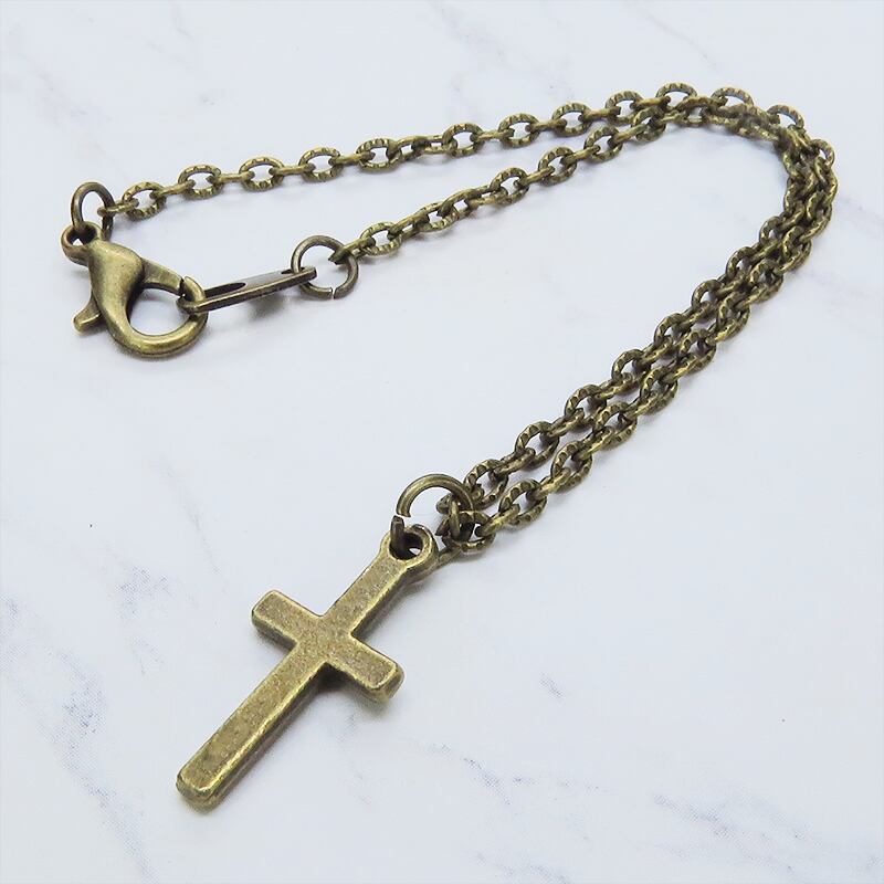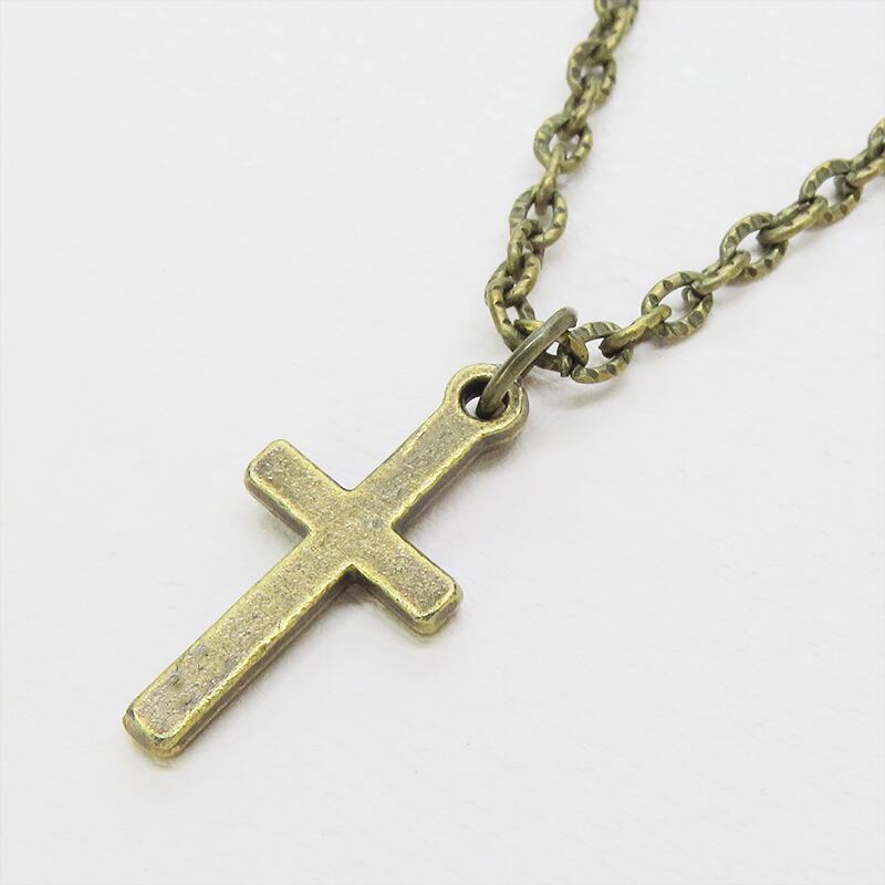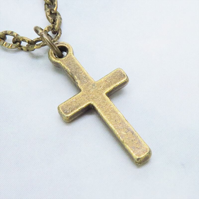 模様の入ったチェーンとフラットでコンパクトなロザリオチャームを組み合わせ、アンティークゴールドカラーで統一したシンプルなデザイン