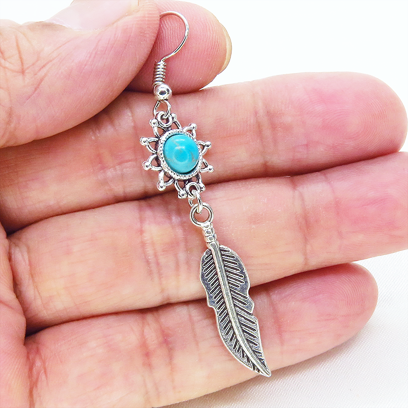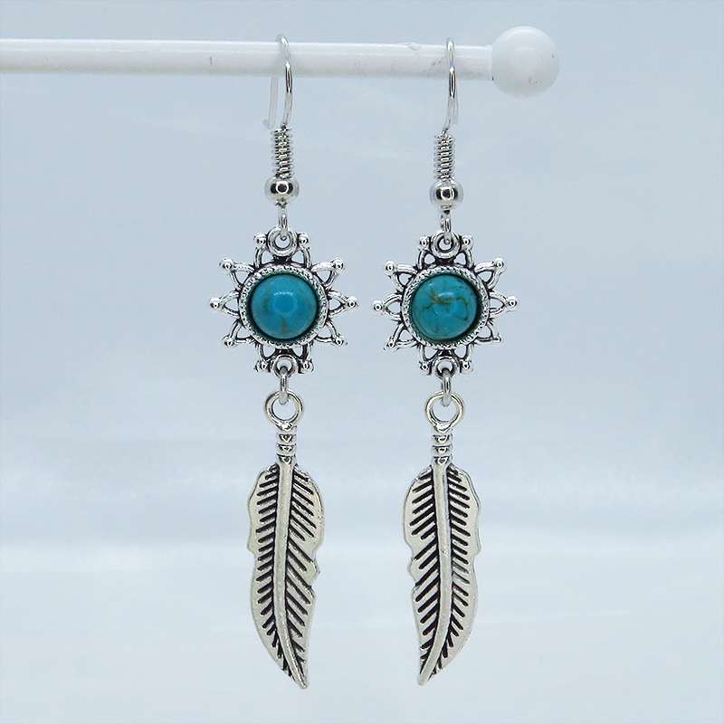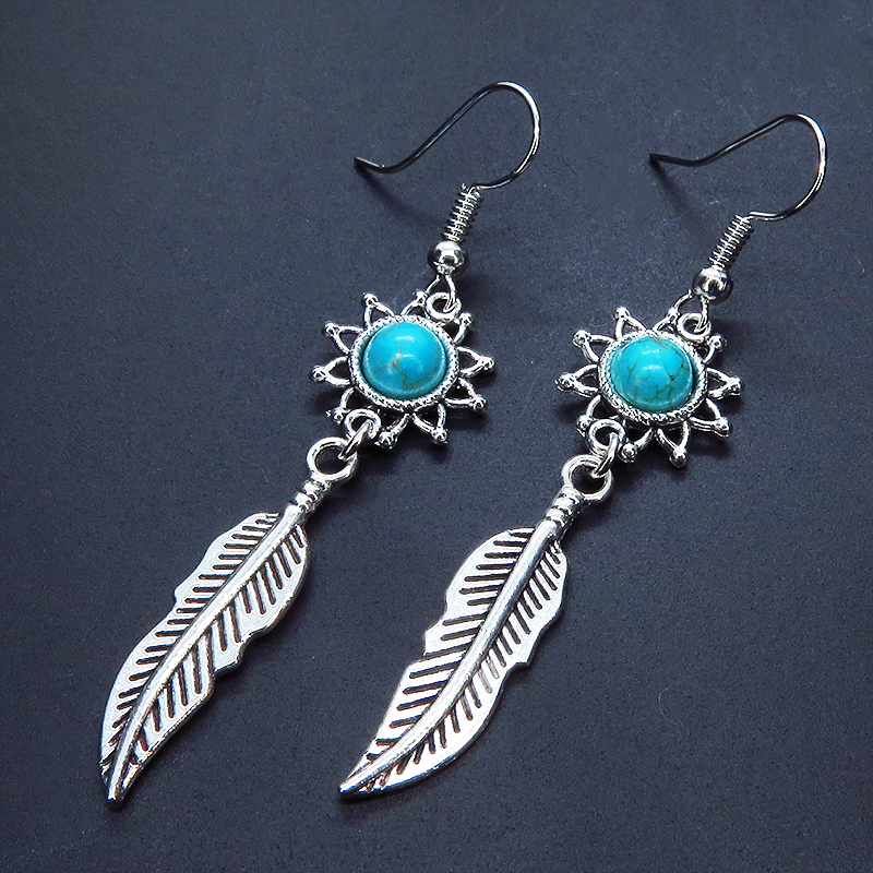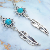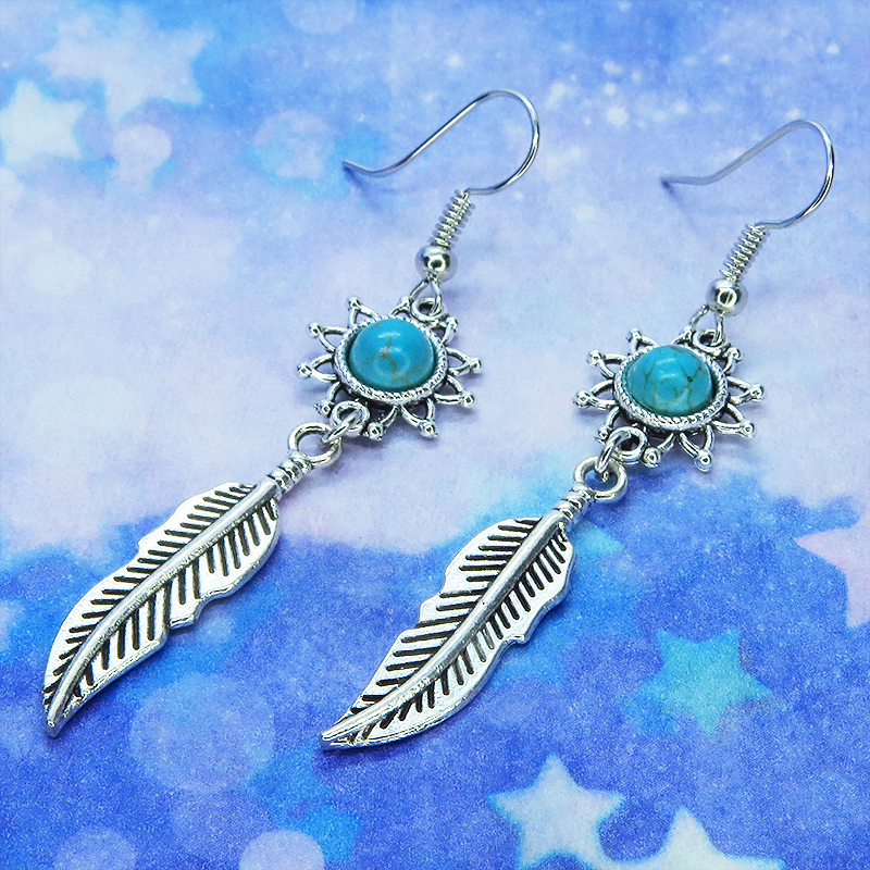 人気のあるフェザーのモチーフにターコイズがはめ込まれたひまわりのモチーフを繋げたピアスです