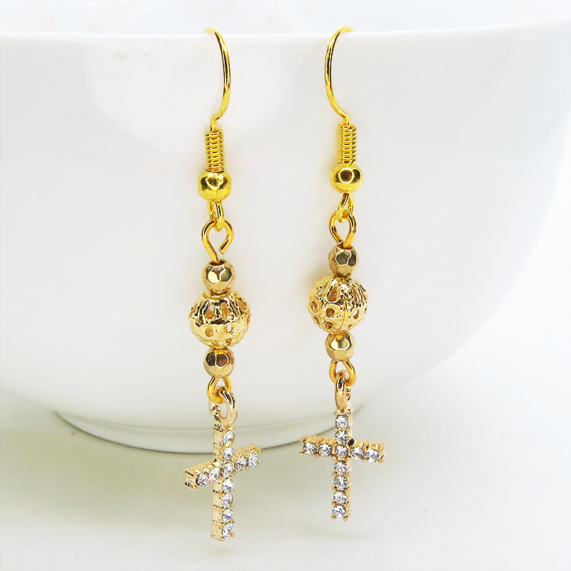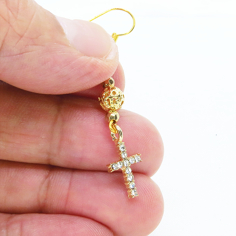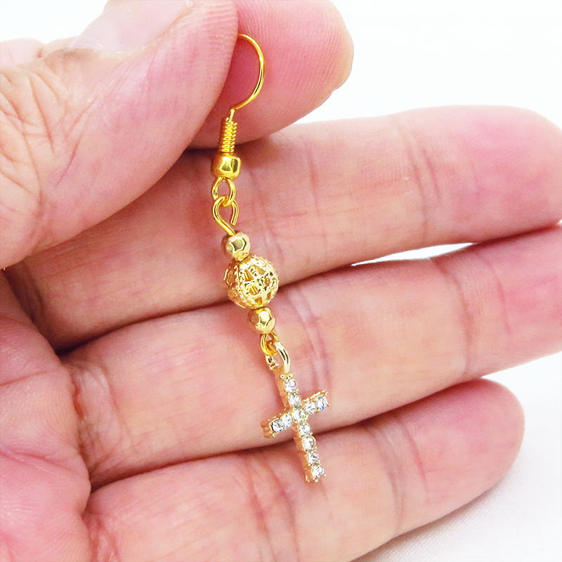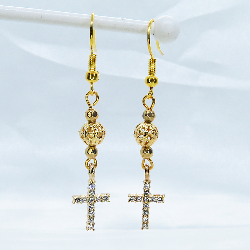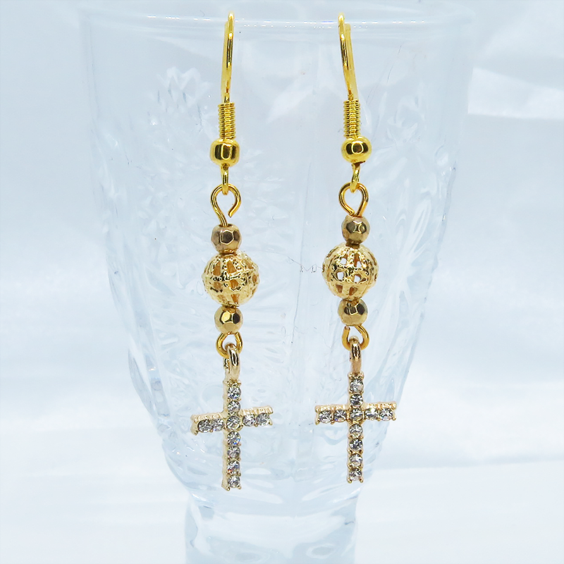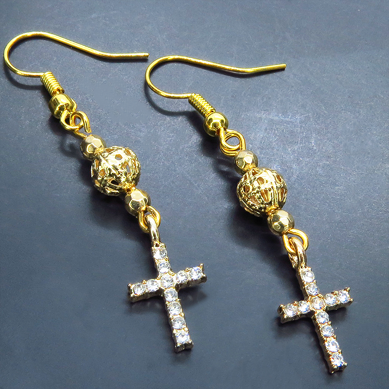 ラインストーンが散りばめられたゴールドカラーのロザリオとメタルビーズを組み合わせたシンプルでコンパクトなピアスです