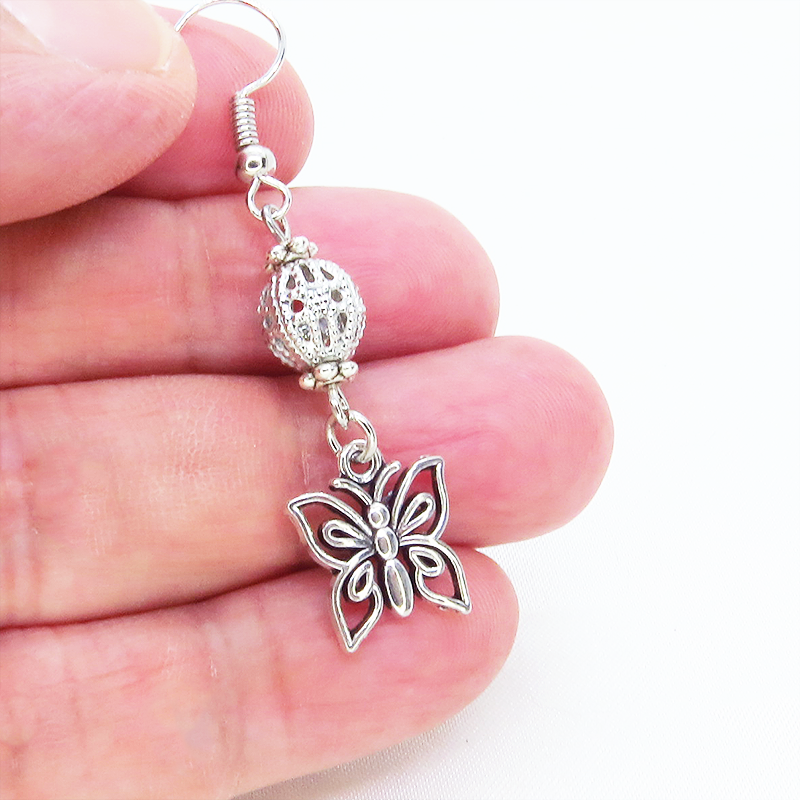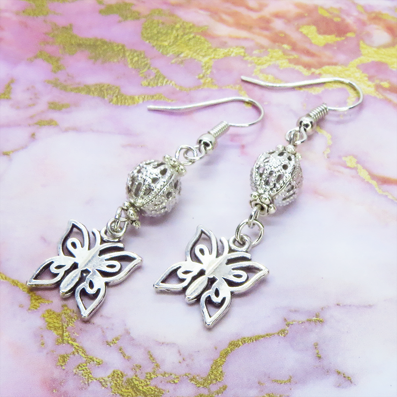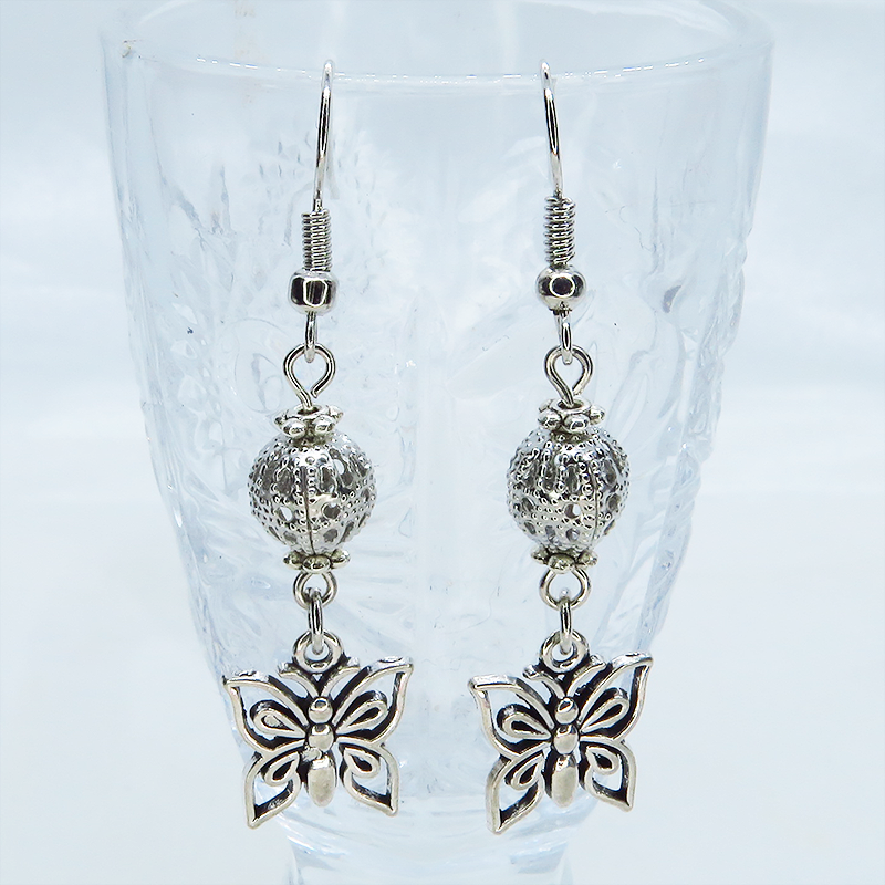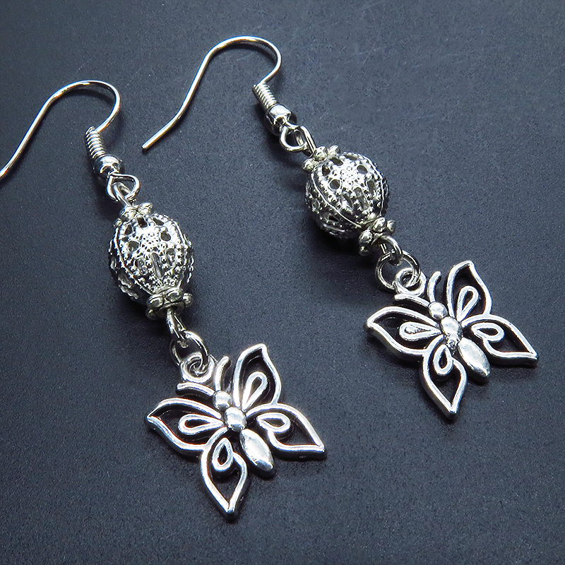 アンティークシルバーの蝶のモチーフとメタルビーズを組合せたコンパクトなピアスです