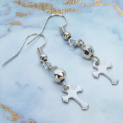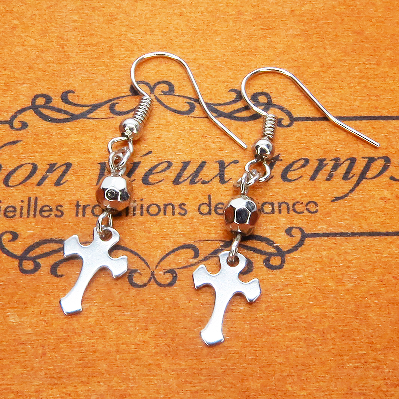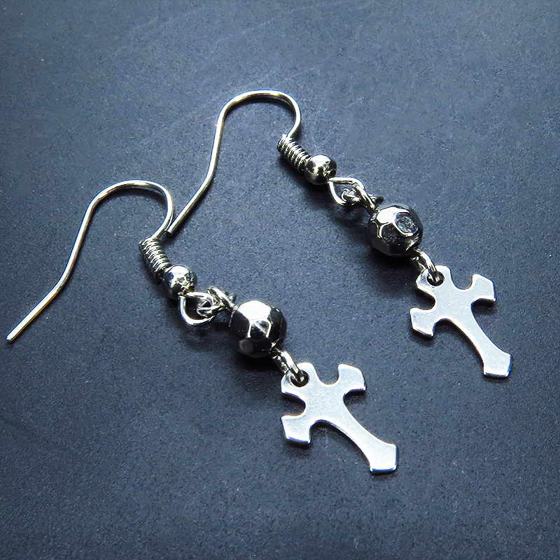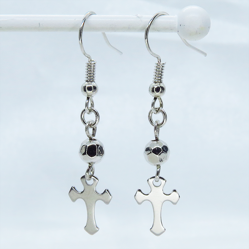 シルバーカラーのロザリオ(十字架)と多面体のメタルビーズを組合せたコンパクトなピアスです