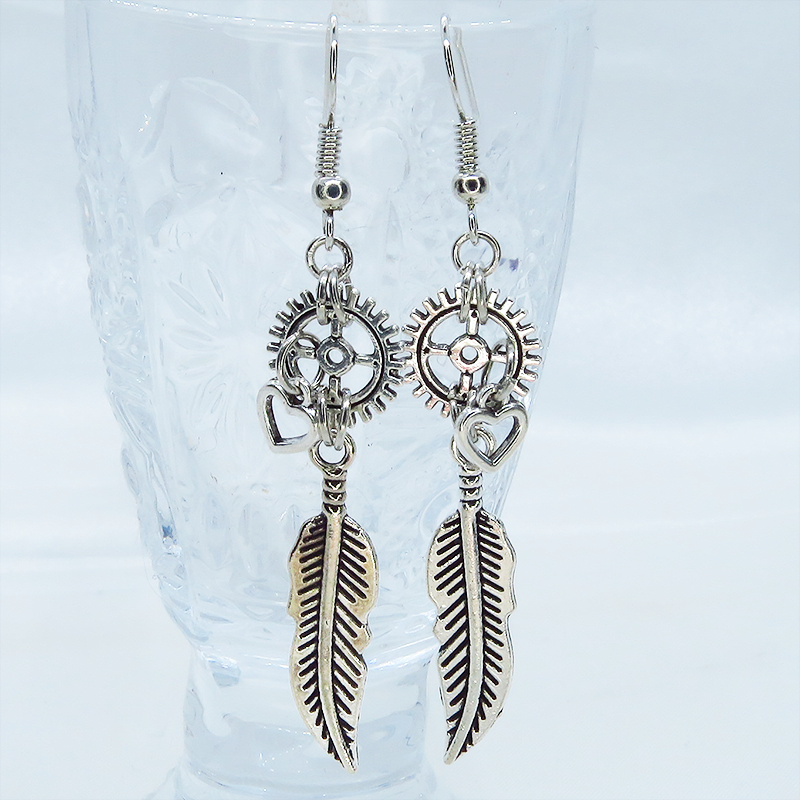 人気のあるフェザーと歯車を組合せたアンティークシルバーのスチームパンク風ピアスです