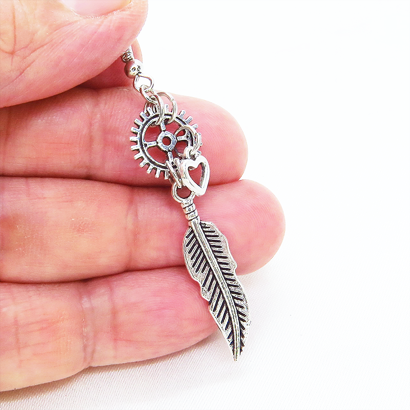 フェザーと歯車を組合せたスリムなピアスでアンティークシルバーの輝きが耳元を飾ります