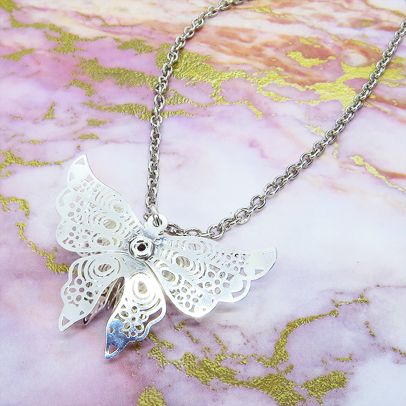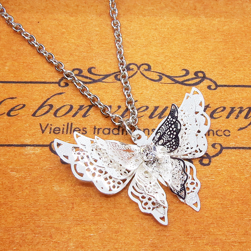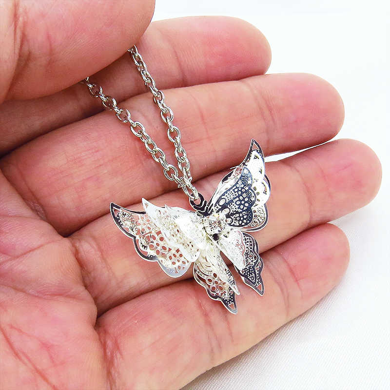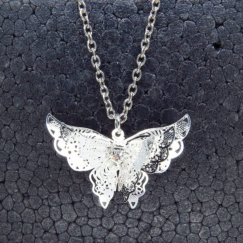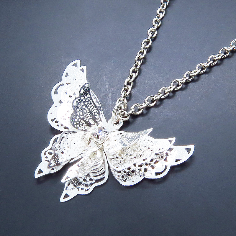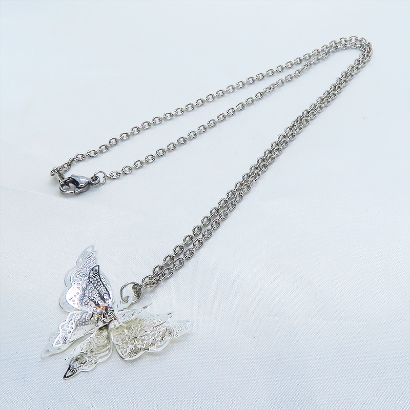 シルバーカラーにメッキされたアルミ合金の繊細なつくりで立体的な蝶の造形のペンダントネックレスです