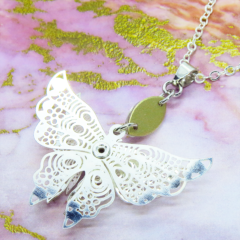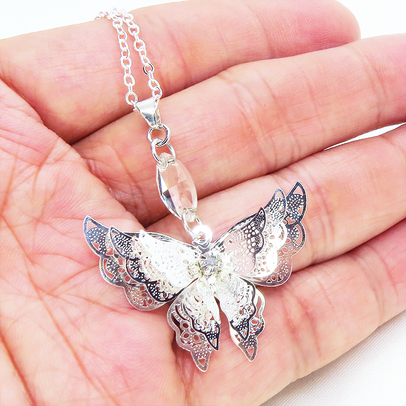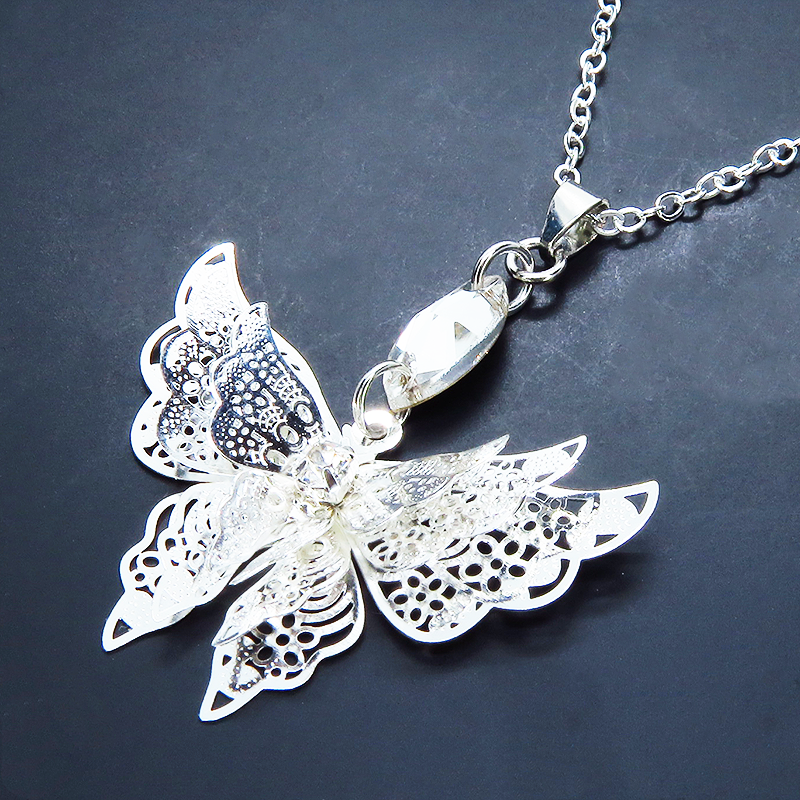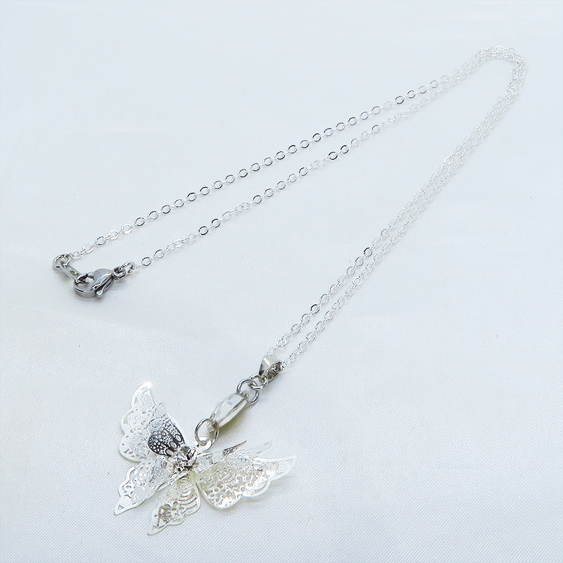 シルバーカラーにメッキされたアルミ合金の繊細なつくりで立体的な蝶の造形のペンダントネックレスです