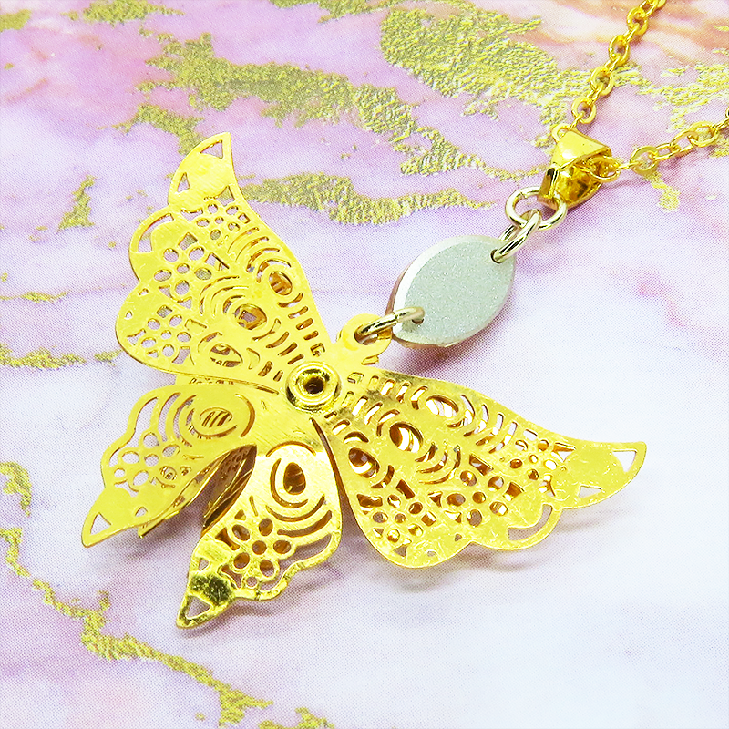 大人可愛いを演出する蝶のネックレスに仕上がっています