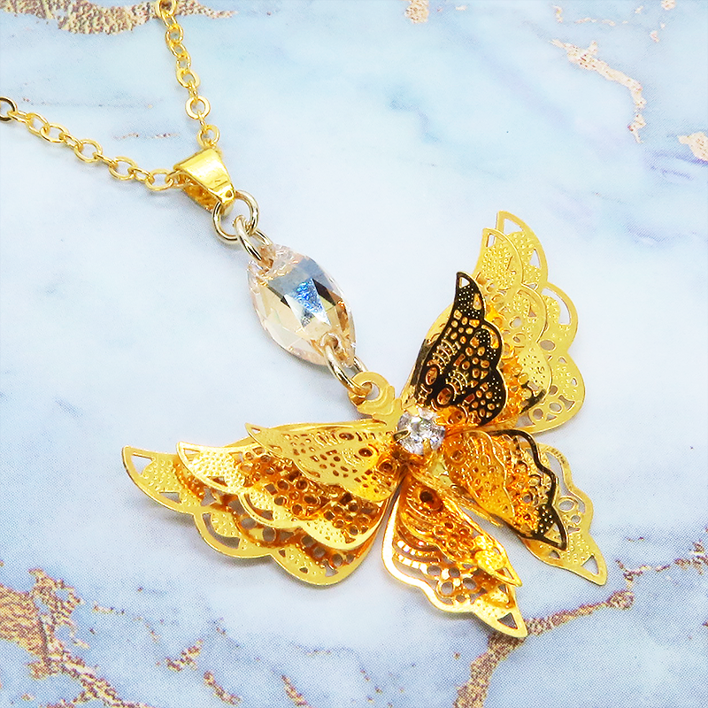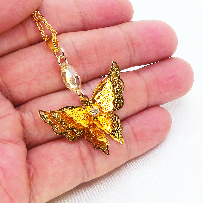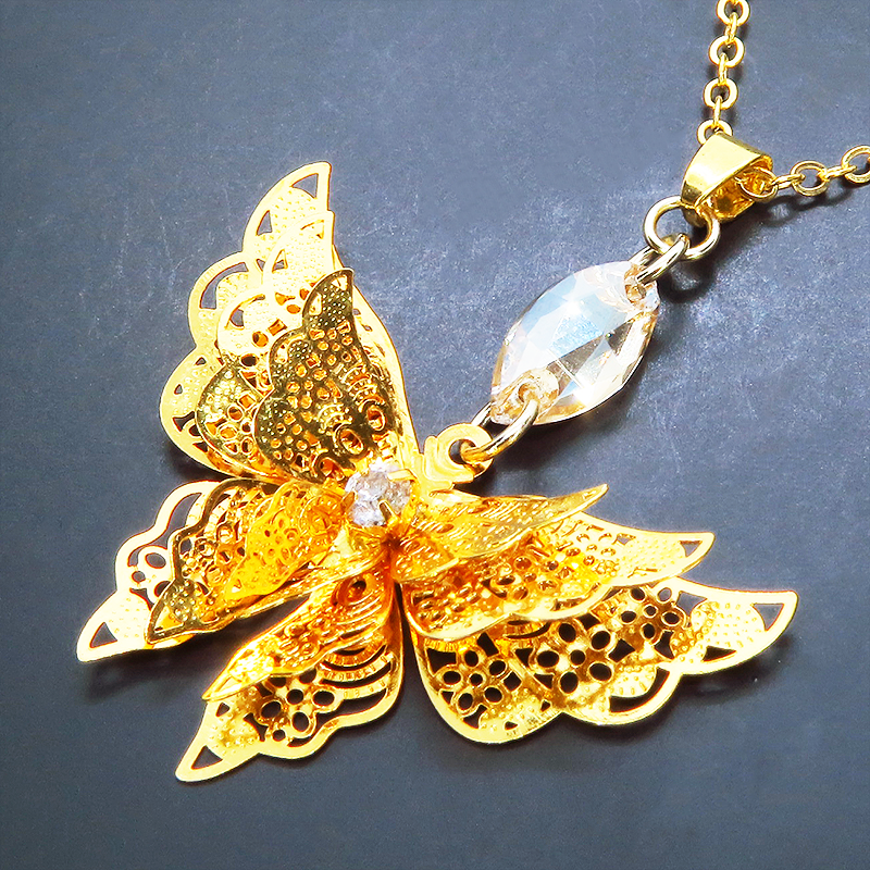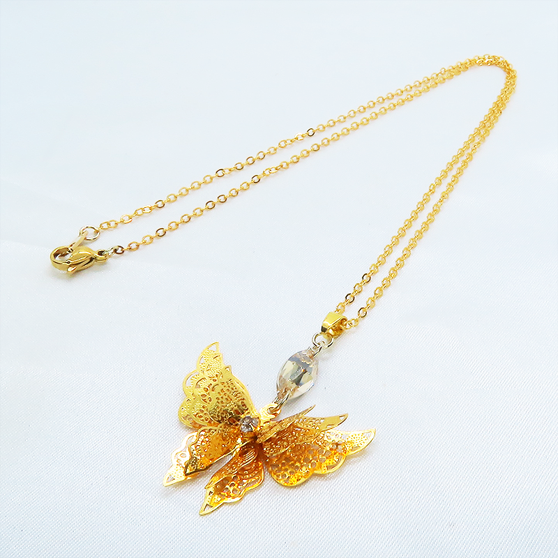 ゴールドカラーにメッキされたアルミ合金の繊細なつくりで立体的な蝶の造形のペンダントネックレスです