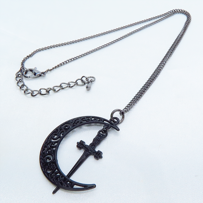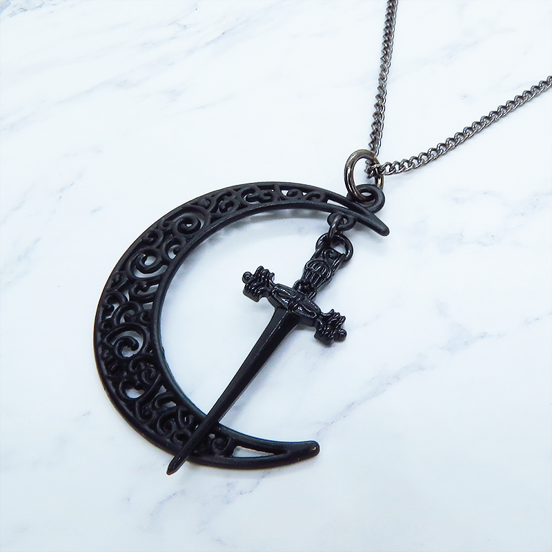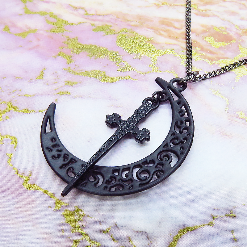 アラベスクのような透かし模様の入った三日月と剣のモチーフを組み合わせたペンダント・ネックレスです