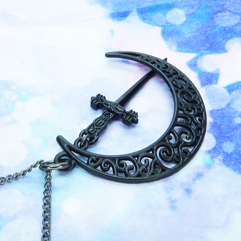 マットなブラックの色彩の三日月モチーフと反射するソードのブラックでバランスをとっています