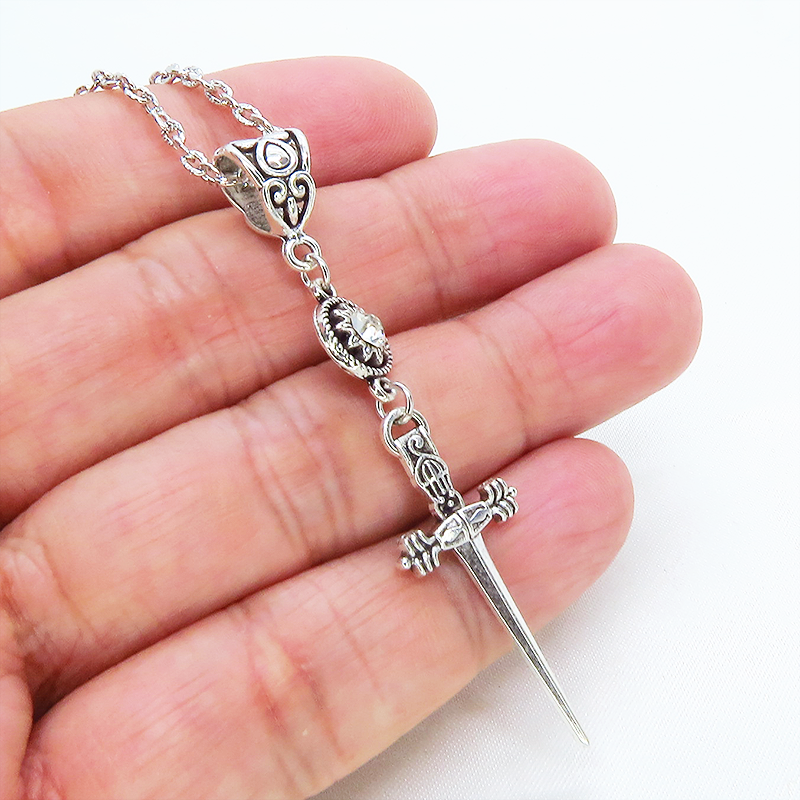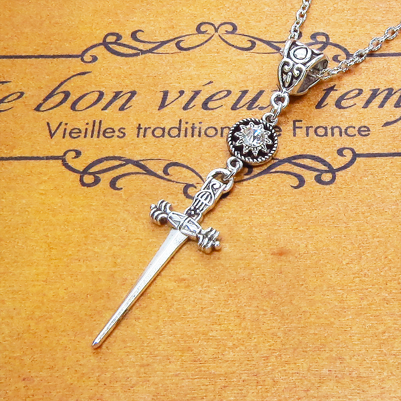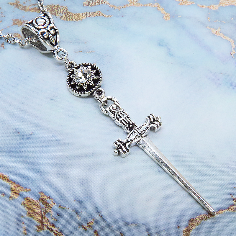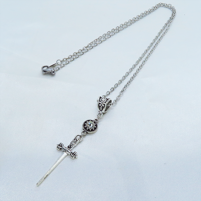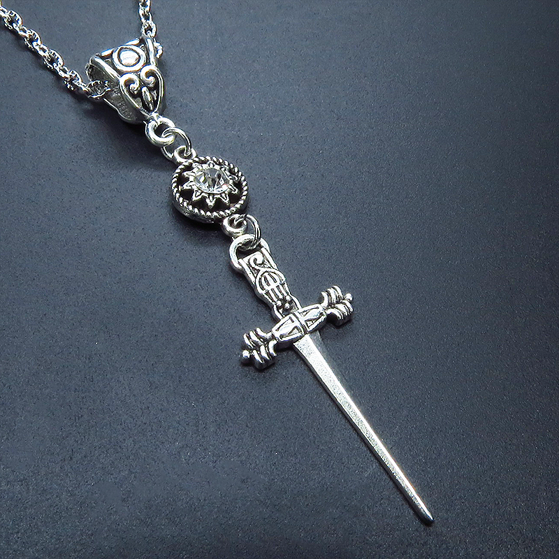 アンティークシルバーのスリムなソードチャームとラインストーンを組み合わせたコンパクトなペンダント・ネックレスです