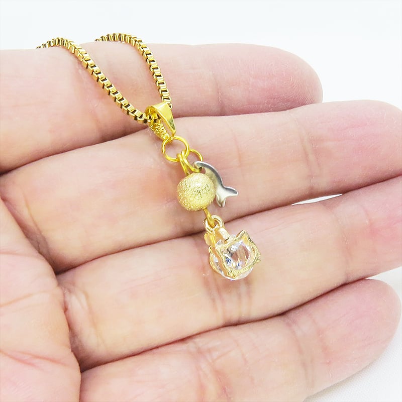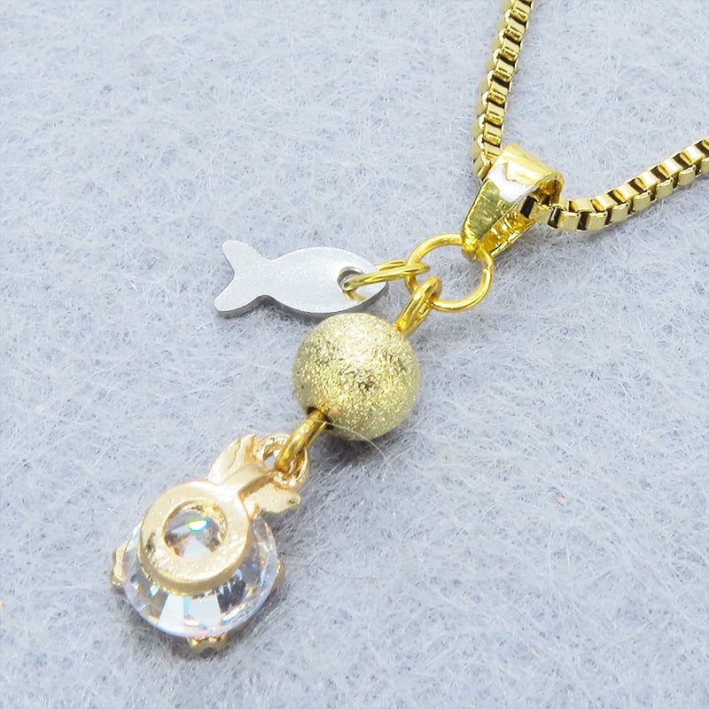 ご使用後は、柔らかい布で皮脂や汗を優しく拭き取ってください。チェーンはステンレス製で錆びにくい素材ですが、輝きを保つために水濡れや汗、化粧品との接触はできるだけ避けることをおすすめします。チャーム部分はデリケートですので、引っかかりや強い衝撃にご注意の上、直射日光を避けて保管してください