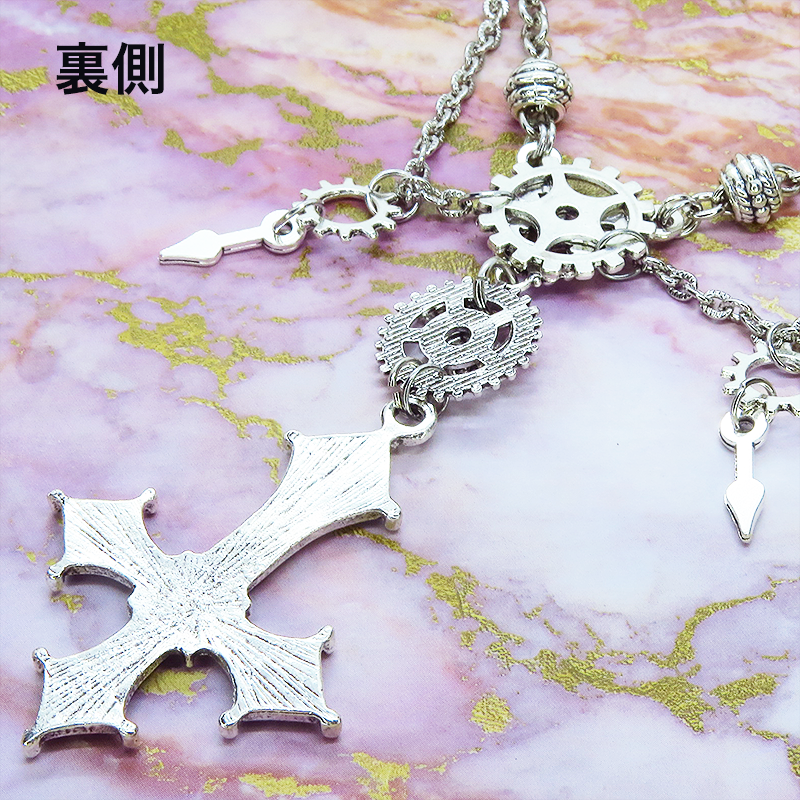 紅く染められた大きなゴシック調の逆さ十字架(逆ロザリオ)と歯車を組み合わせたスチームパンク風ペンダント・ネックレスです