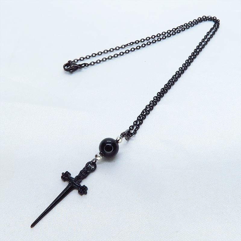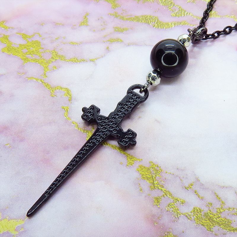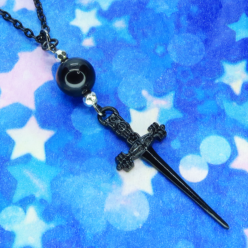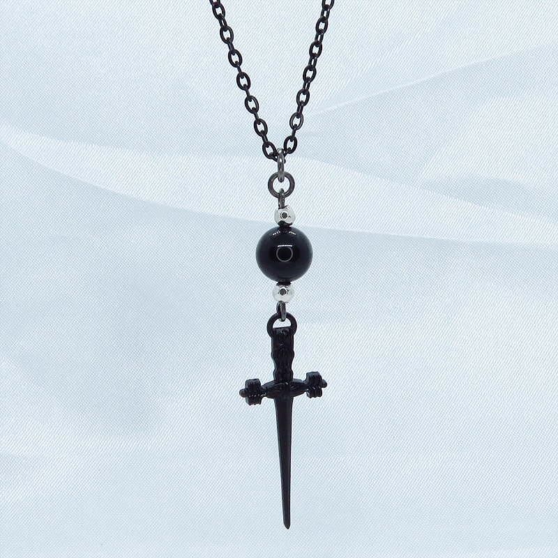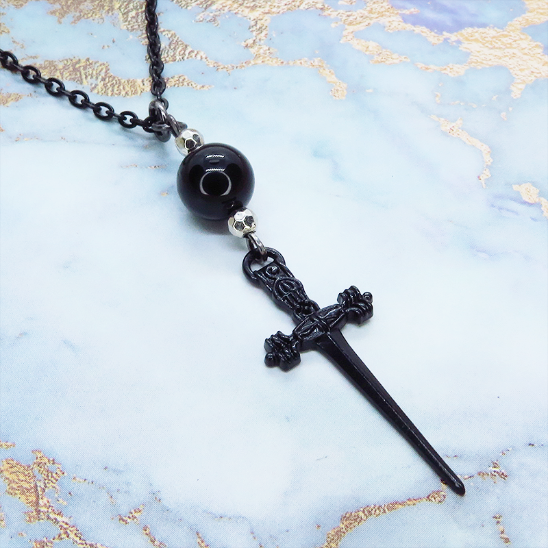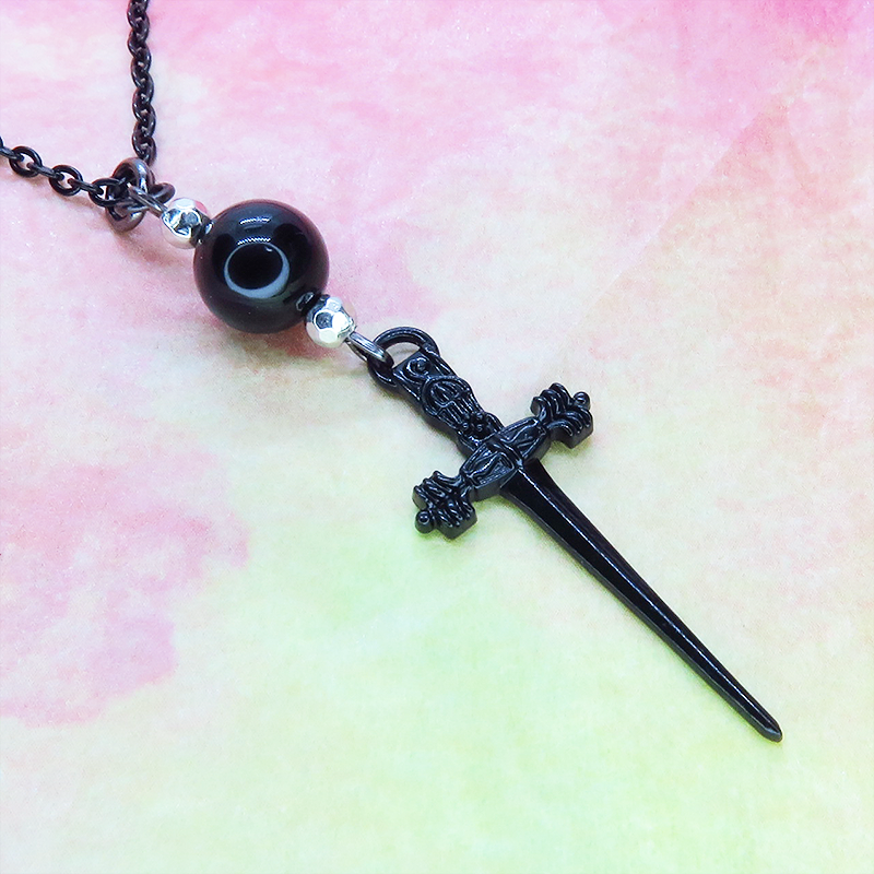 細身のソード(剣)のチャームとオニキスを組み合わせたペンダント・ネックレスです