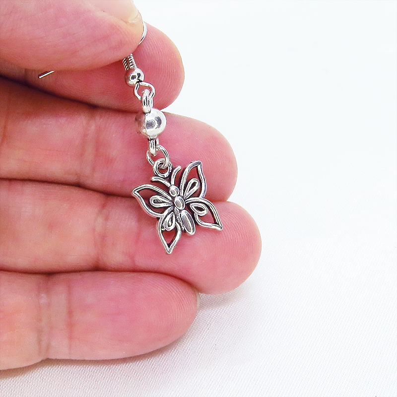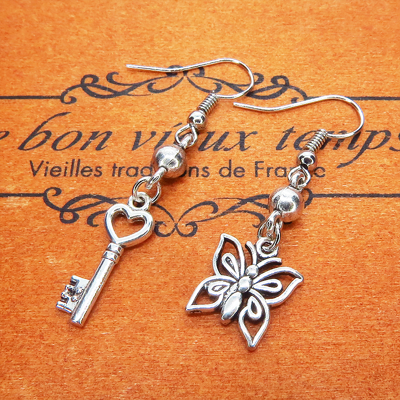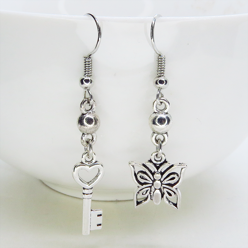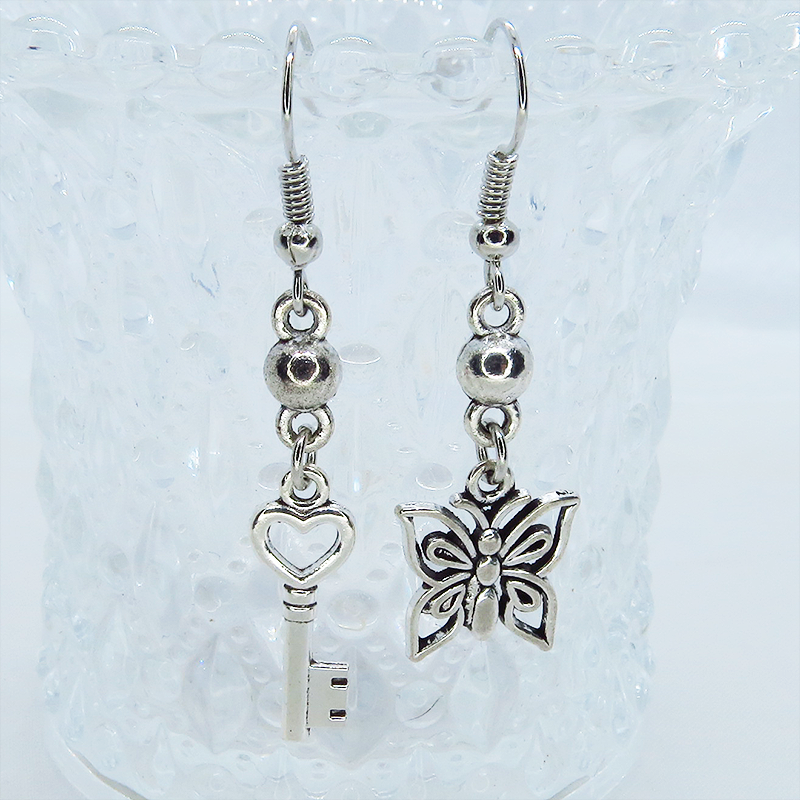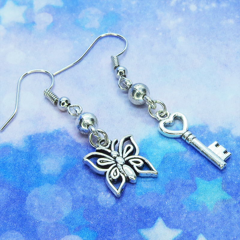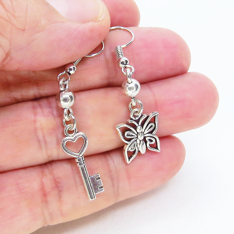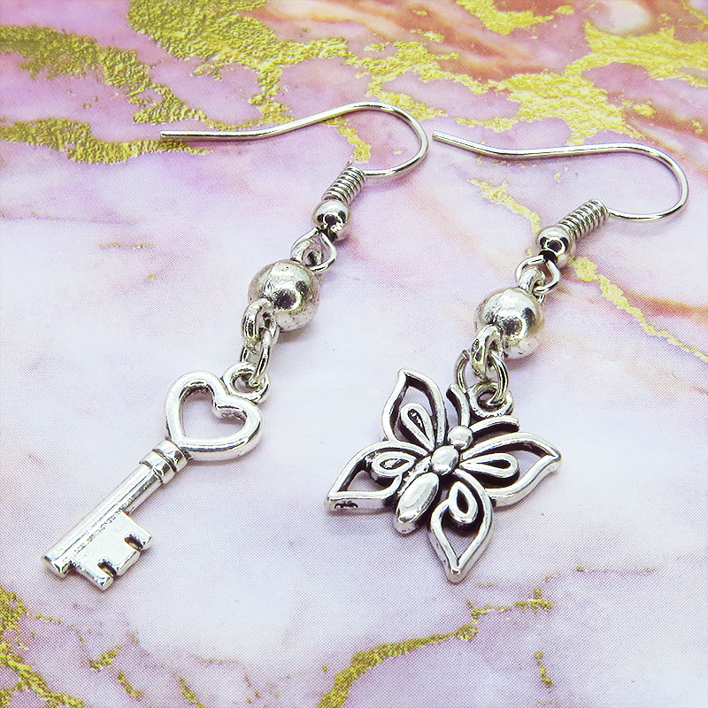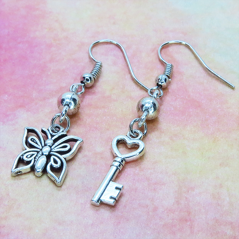 アンティークシルバーカラーの蝶のモチーフとハートのついたカギのモチーフを組合せたアシンメトリーピアスです