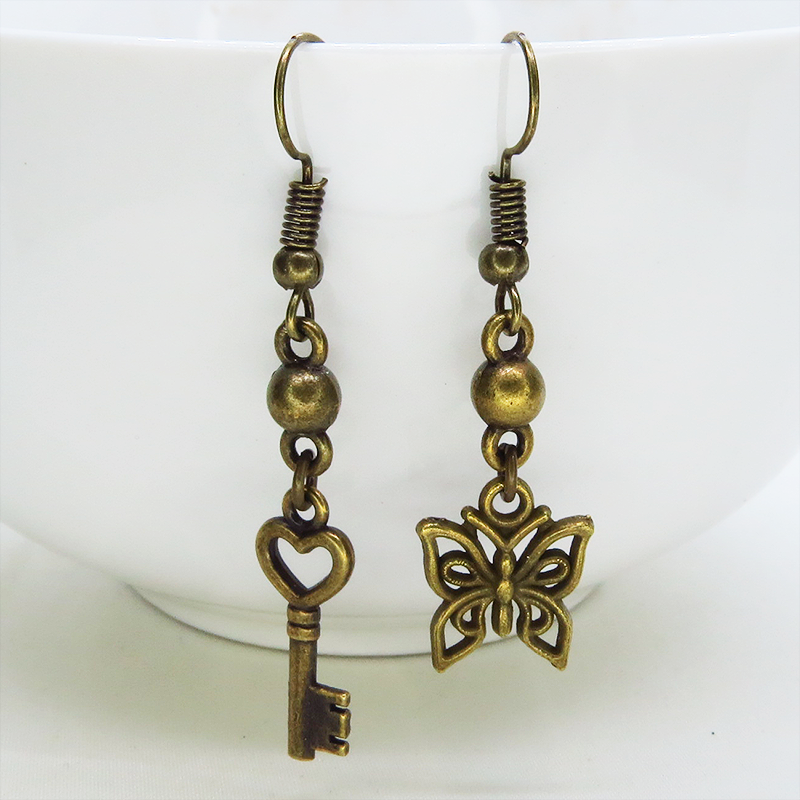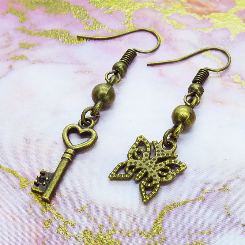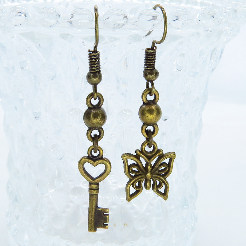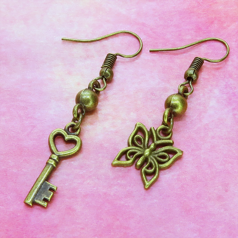 アンティークゴールドカラーの蝶のモチーフとハートのついたカギのモチーフを組合せたアシンメトリーピアスです