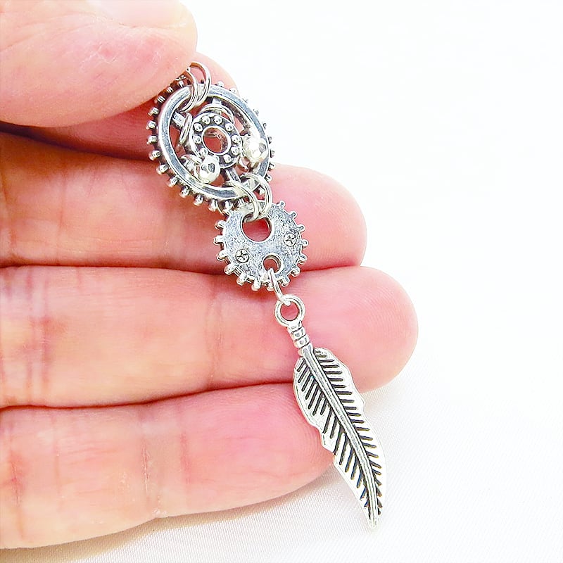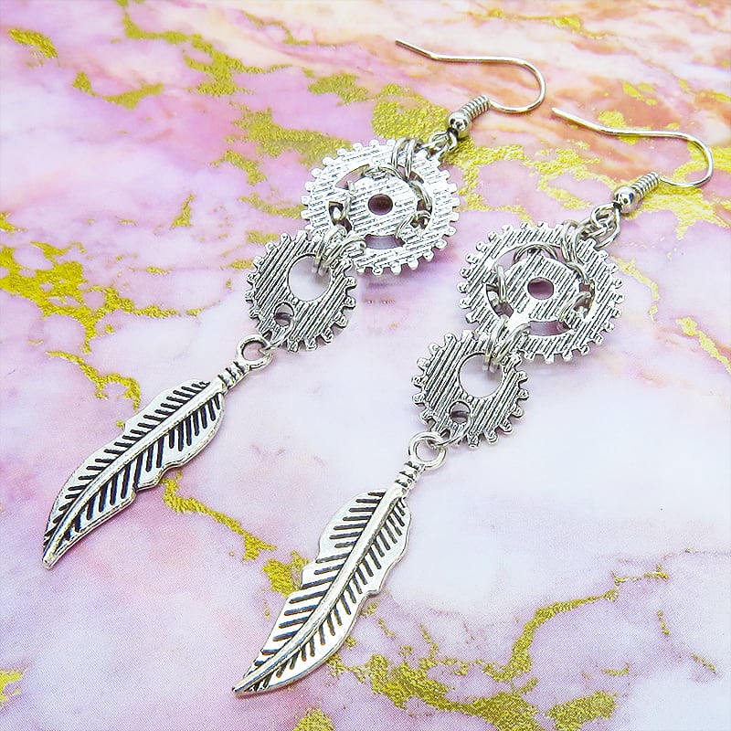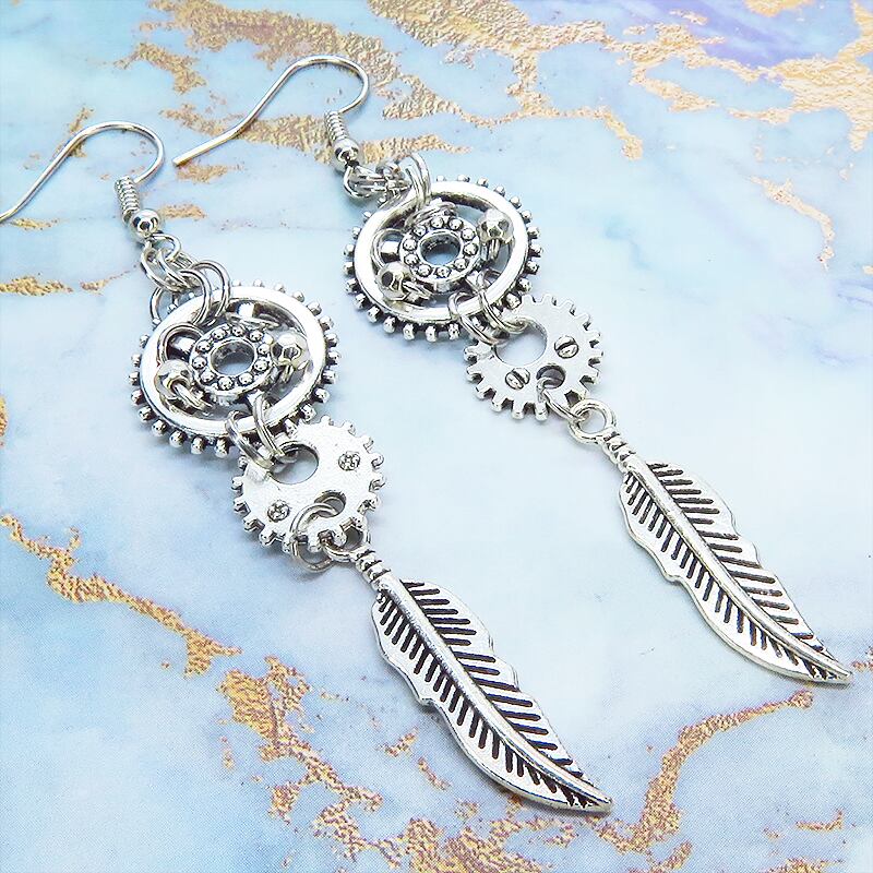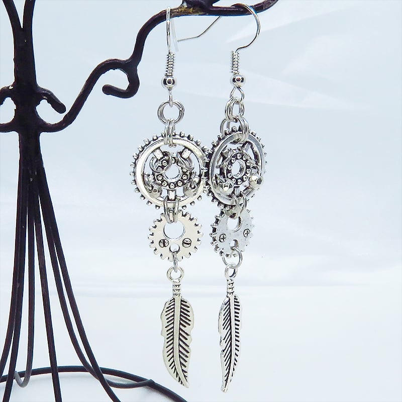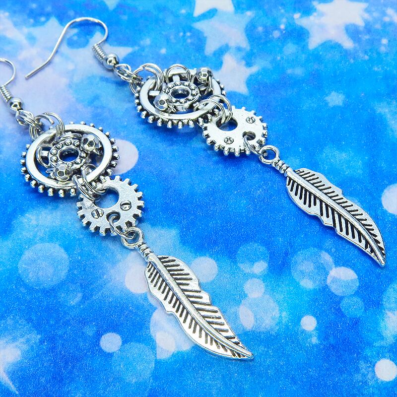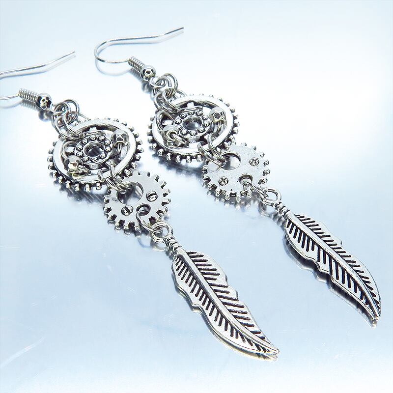 アンティークシルバーのフェザーと大小形状の異なる歯車を組合せたスチームパンク風ピアスです