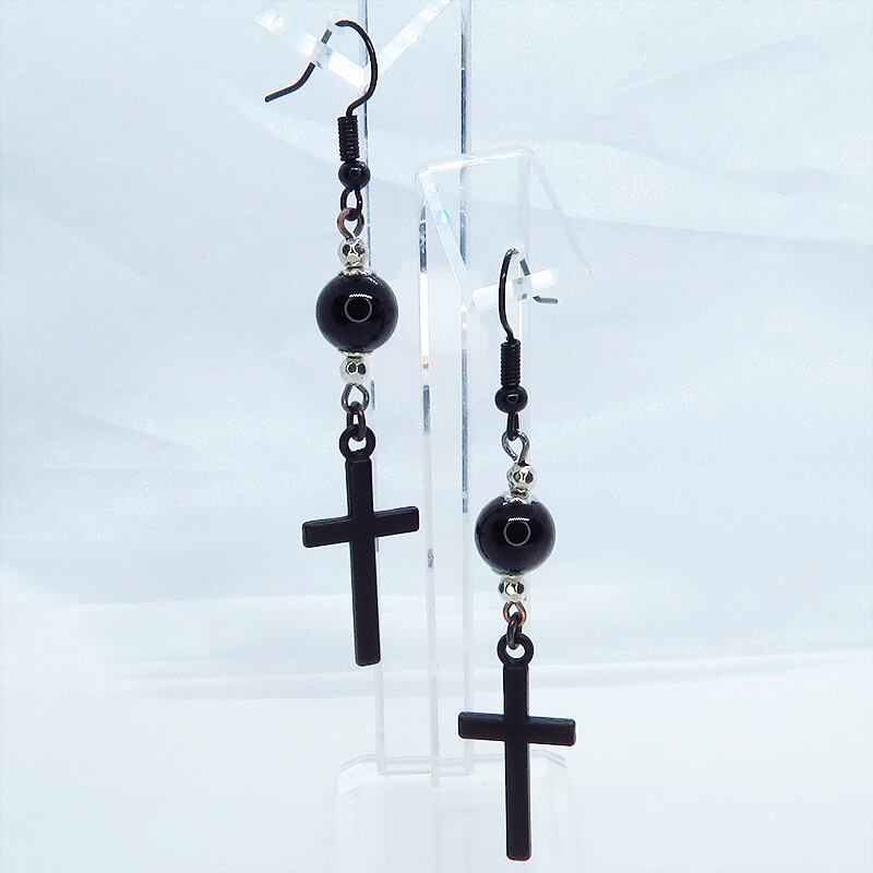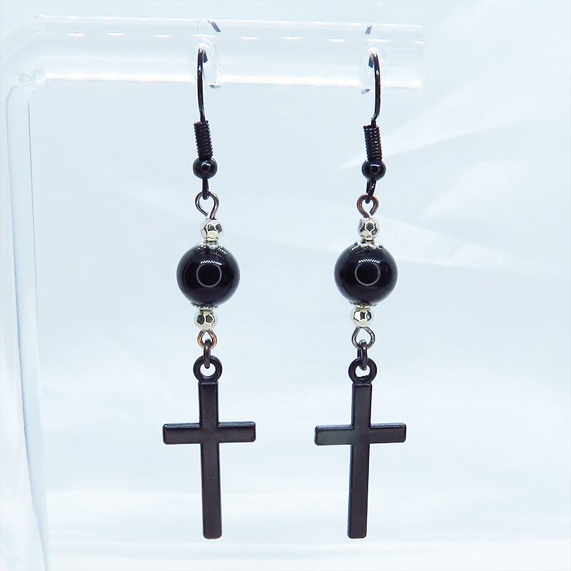 黒のロザリオ(十字架)と黒く輝く大きめのオニキスを組合せたシンプルでスマートなブラックピアスです