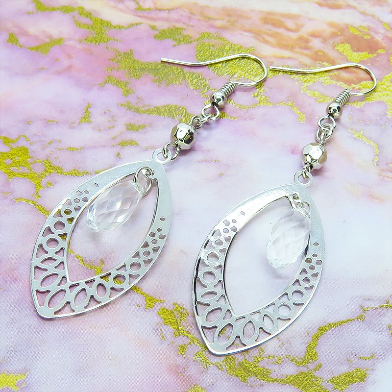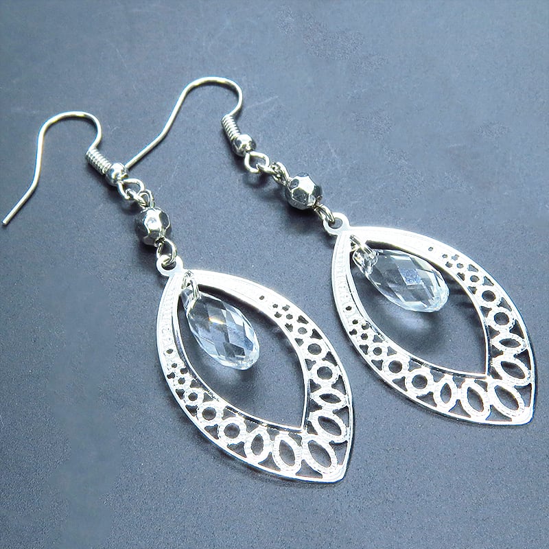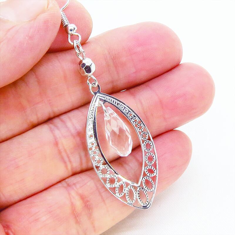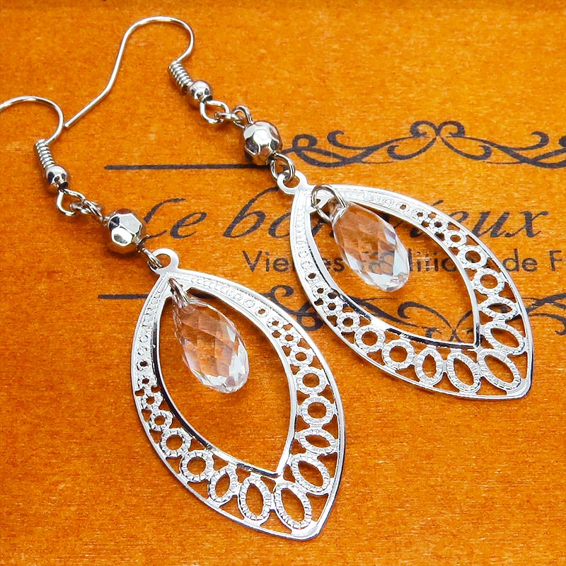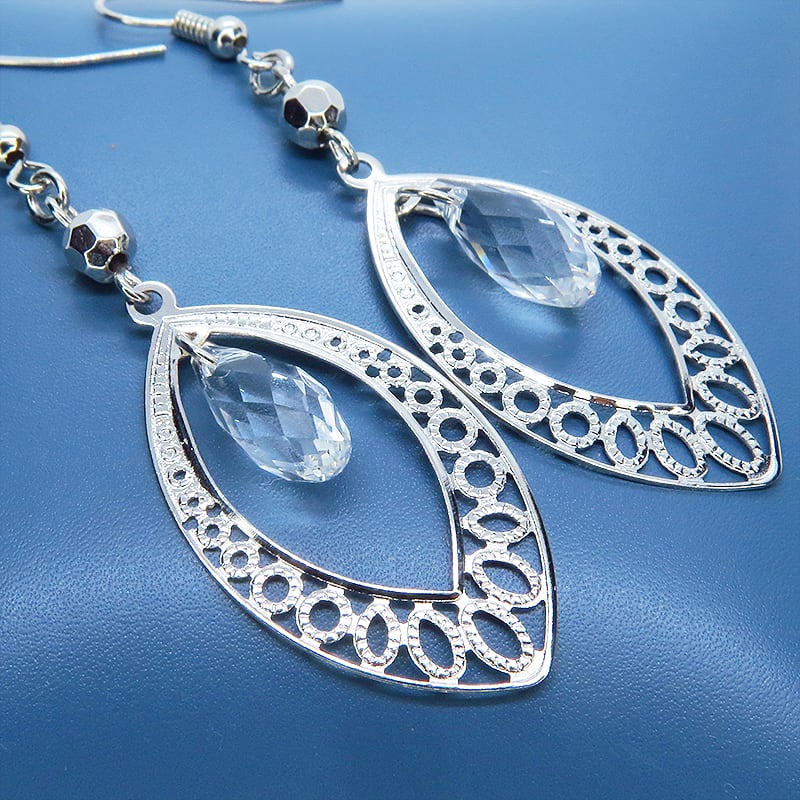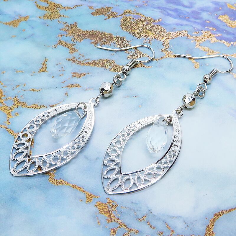 シルバーカラーのアラベスク調の透かし模様入りティアドロップモチーフを使っています