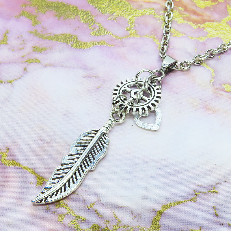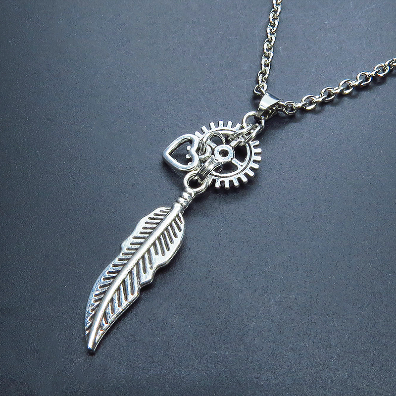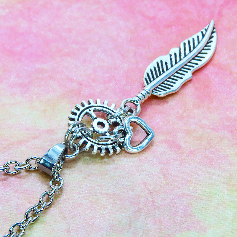 深みのあるアンティークシルバーカラーで統一し、空へと羽ばたくフェザー(羽)と時を刻む精密な歯車を組み合わせました