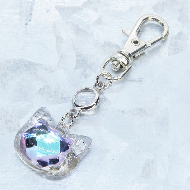 ローズレインボーカラーの猫フェイス型ラインストーンを透明感あふれるクリアレジンで丁寧に包み込み、猫の愛らしい顔立ちを表現しました