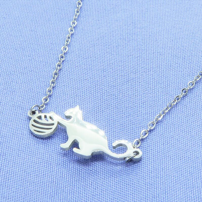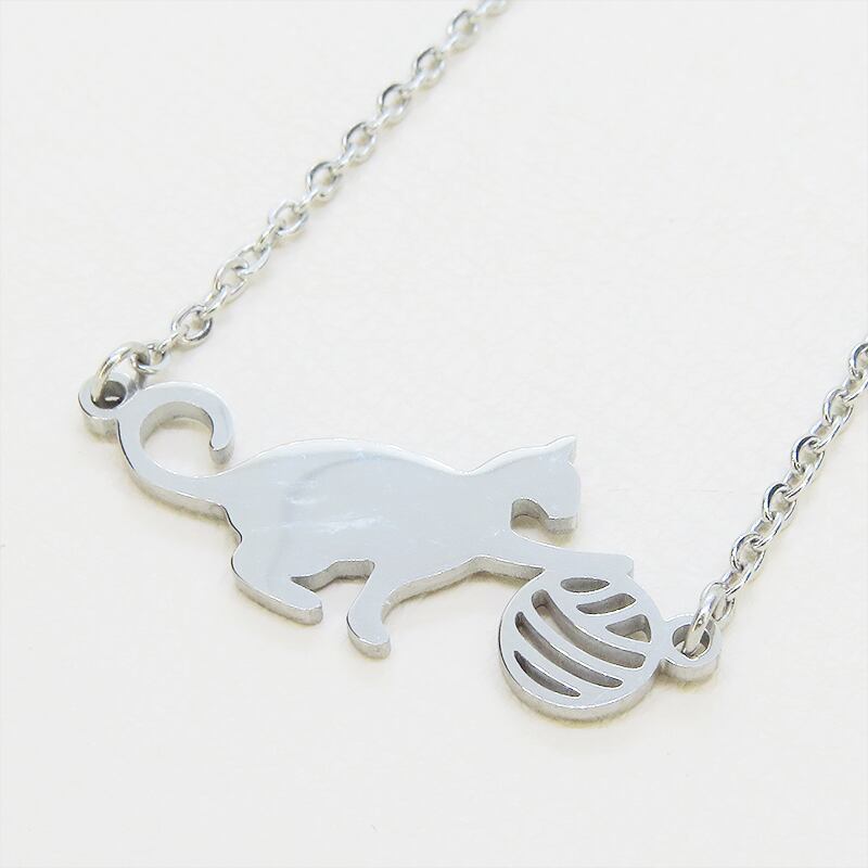 小さな球体に向かって夢中で手を伸ばす、愛らしい猫のシルエットをモチーフにしたペンダントです