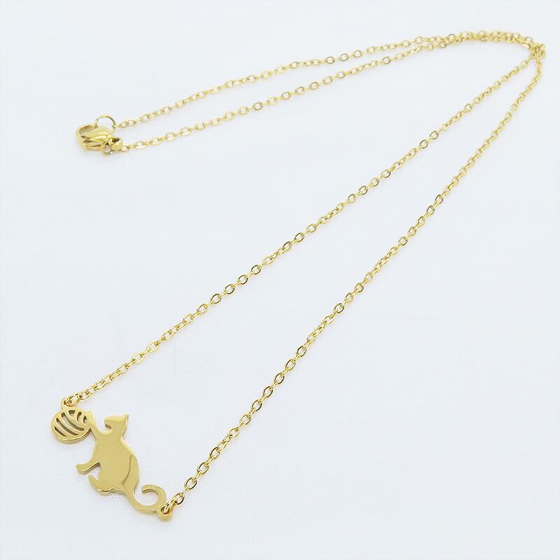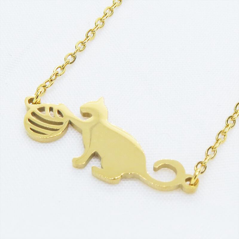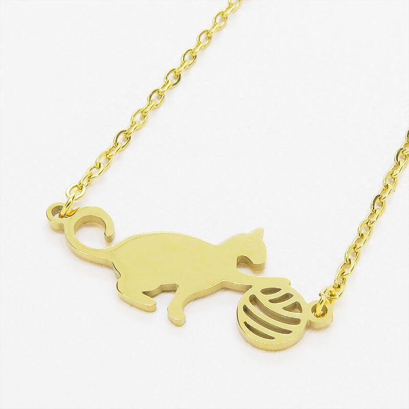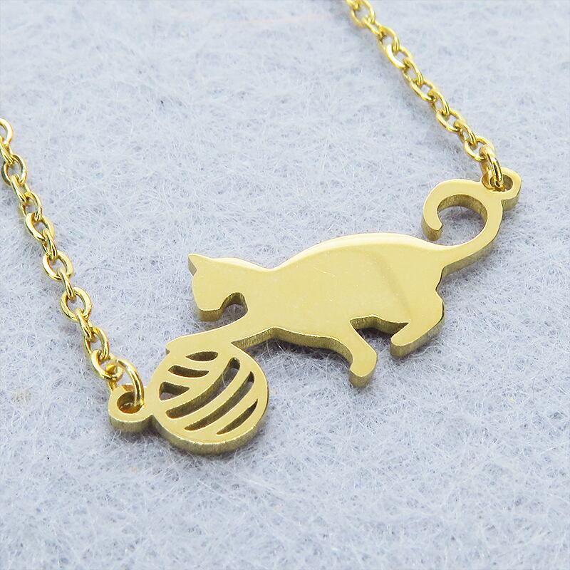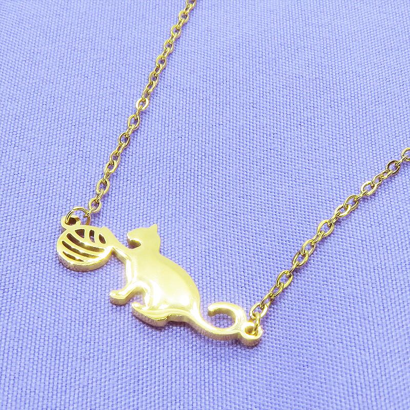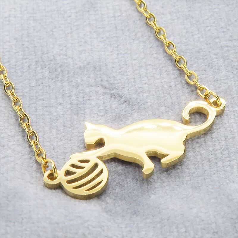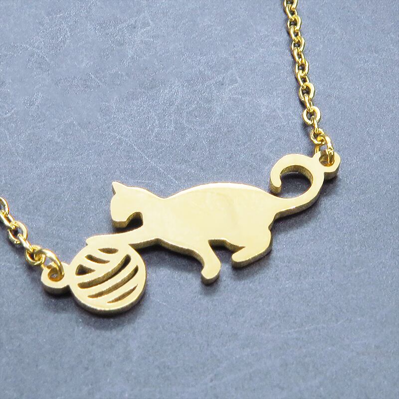 小さな球体に向かって夢中で手を伸ばす、愛らしい猫のシルエットをモチーフにしたペンダントです
