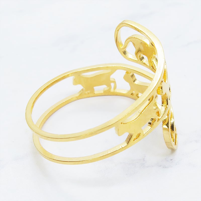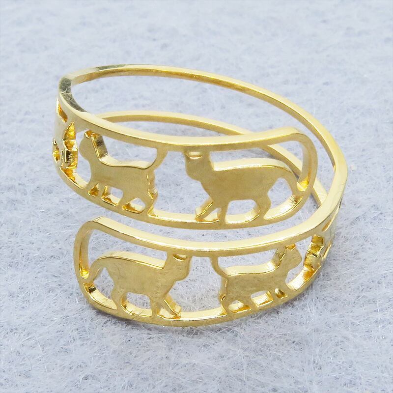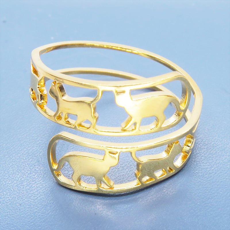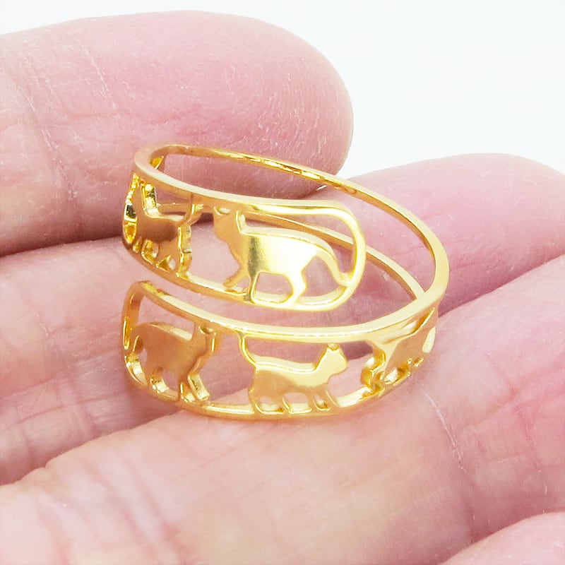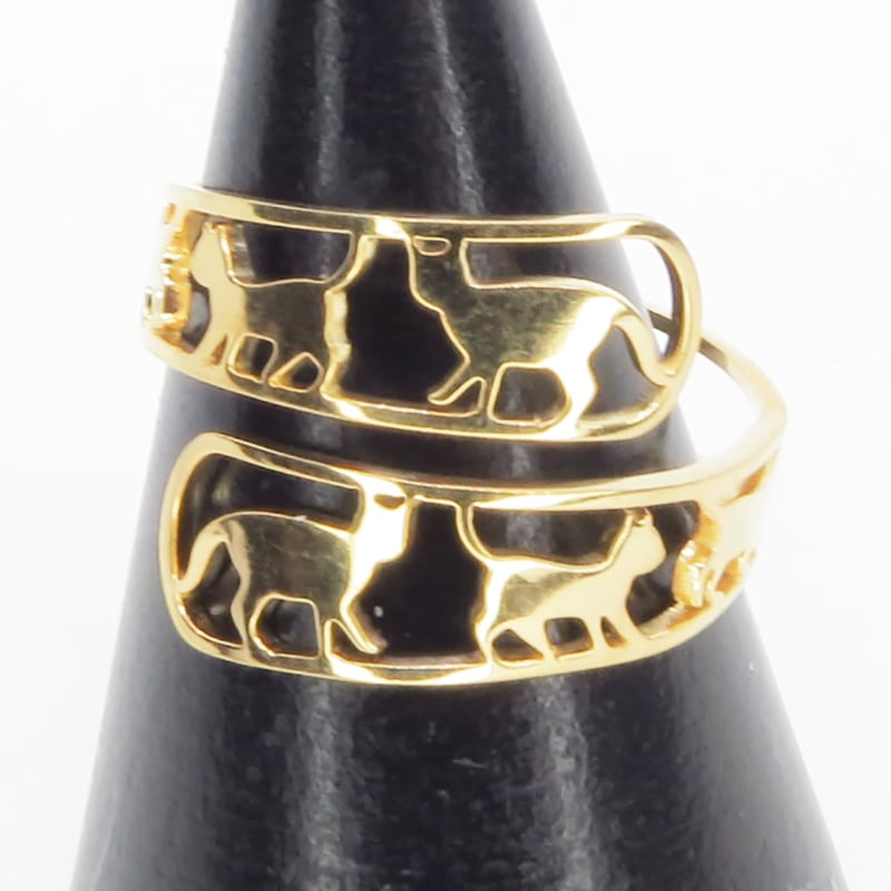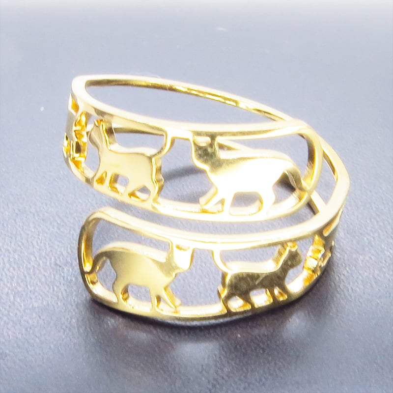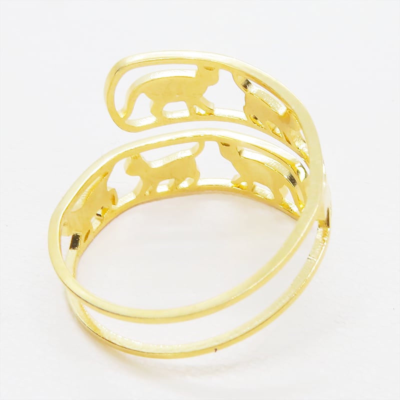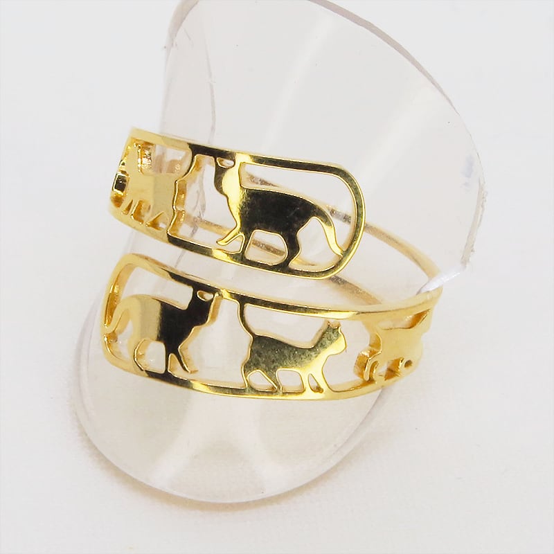 ゴールドカラーの華やかな輝きの中に、歩いている猫のシルエットが途切れることなく連なり、まるで指のまわりをお散歩しているような遊び心あふれるデザインです