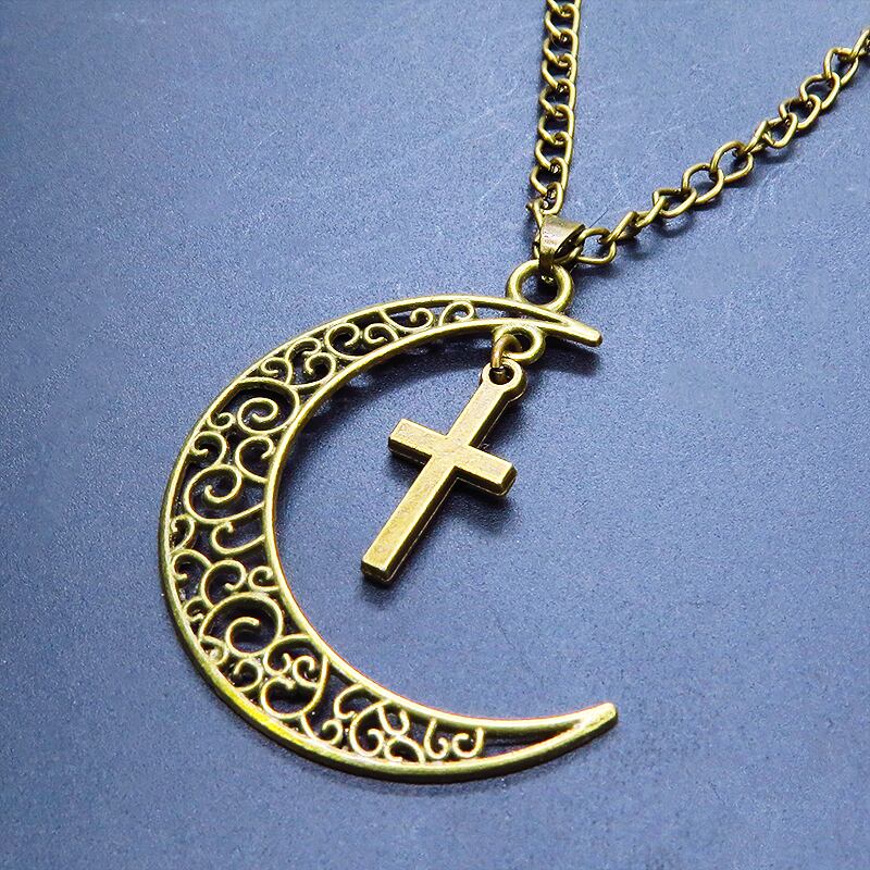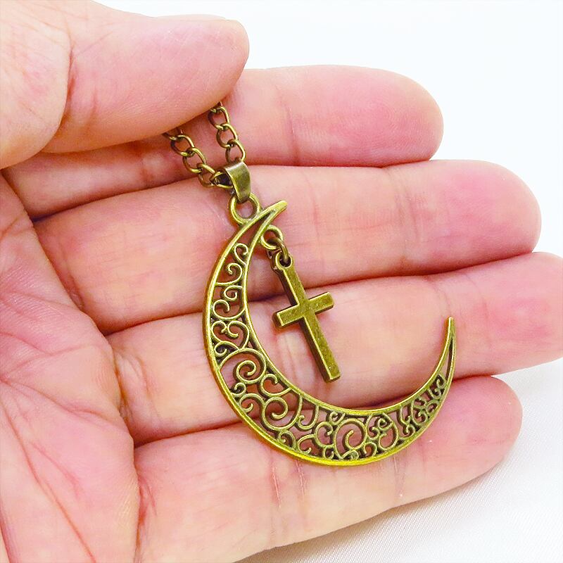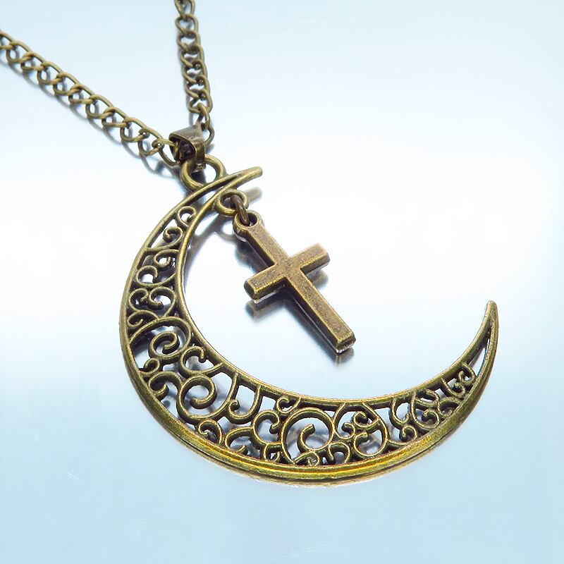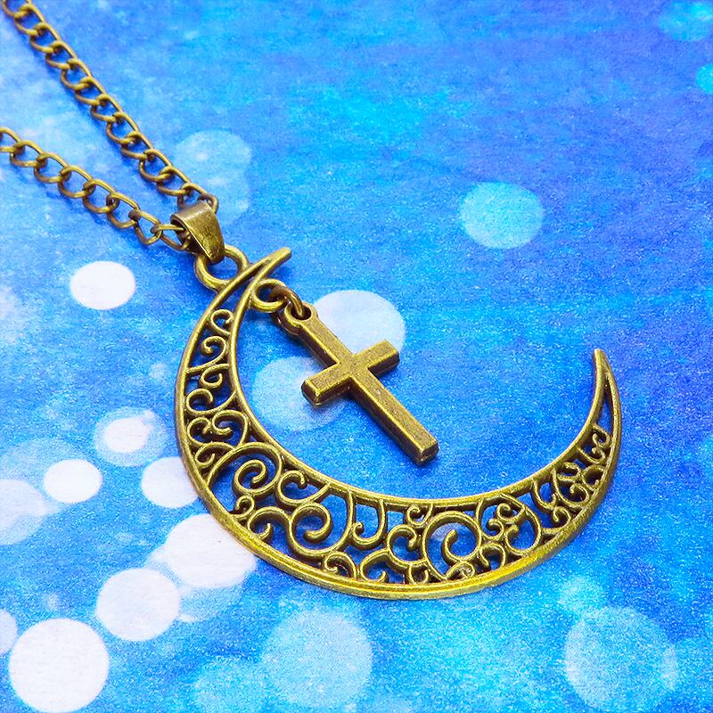 月の曲線からしなやかに揺れるのは、端正な造形のロザリオ(十字架)