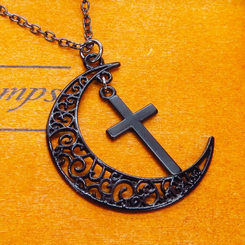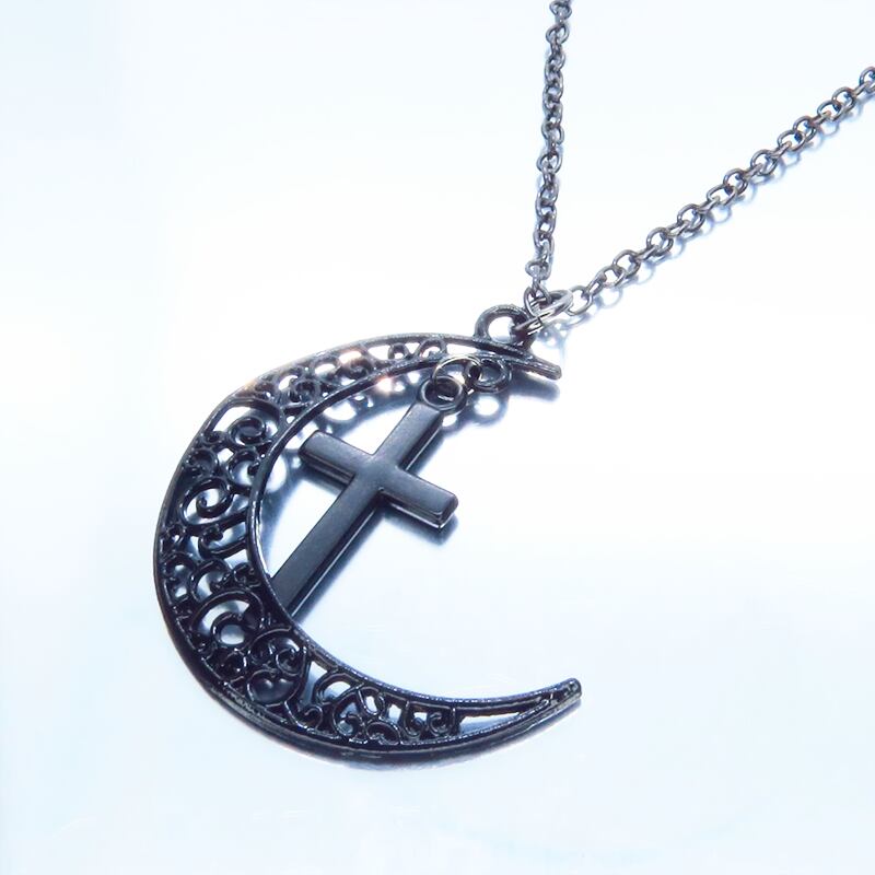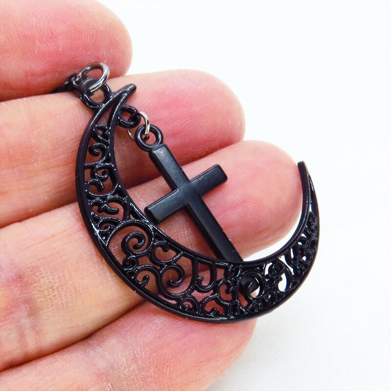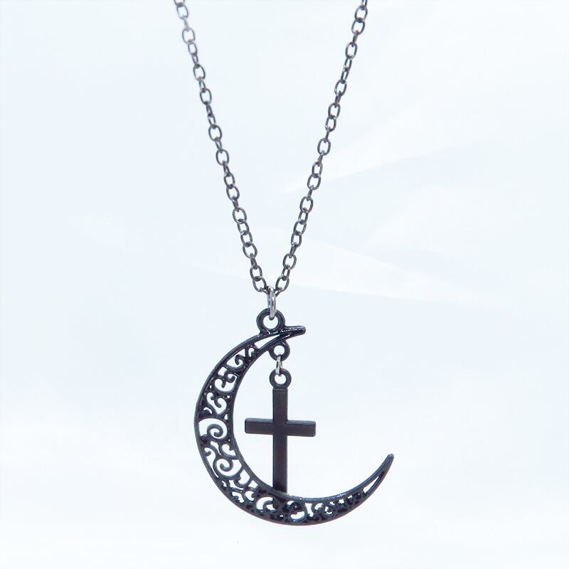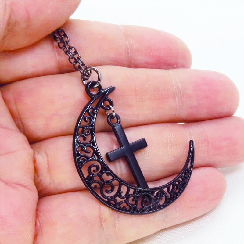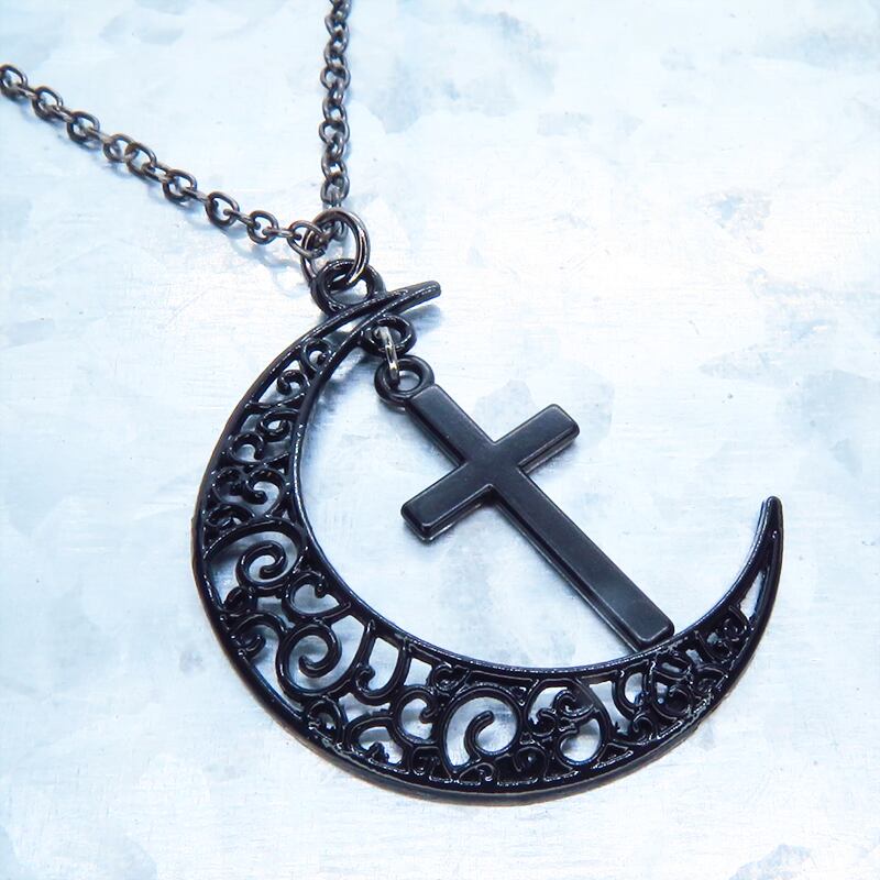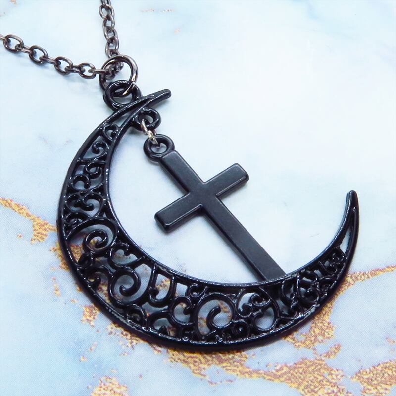月の曲線からしなやかに揺れるのは、端正な造形のロザリオ(十字架)
