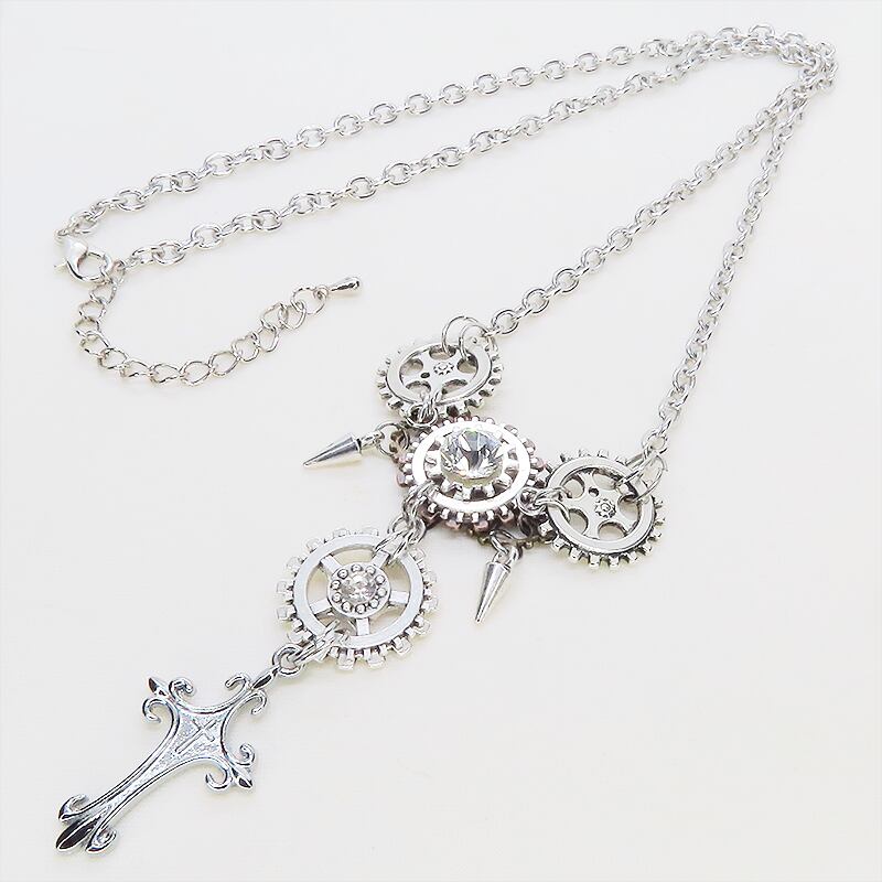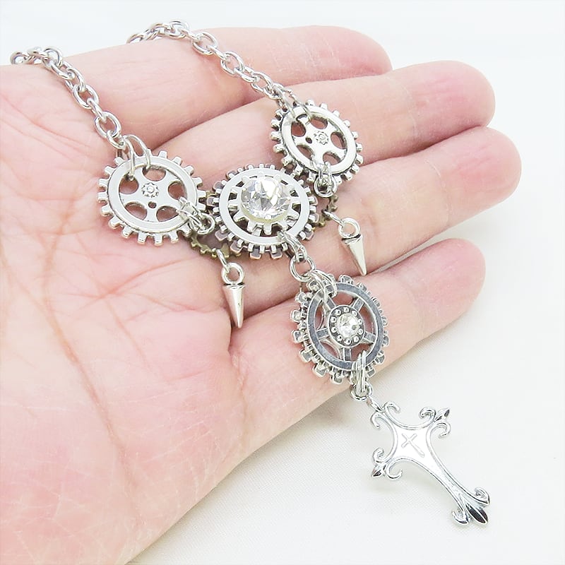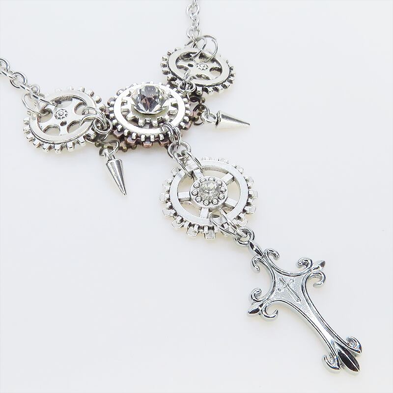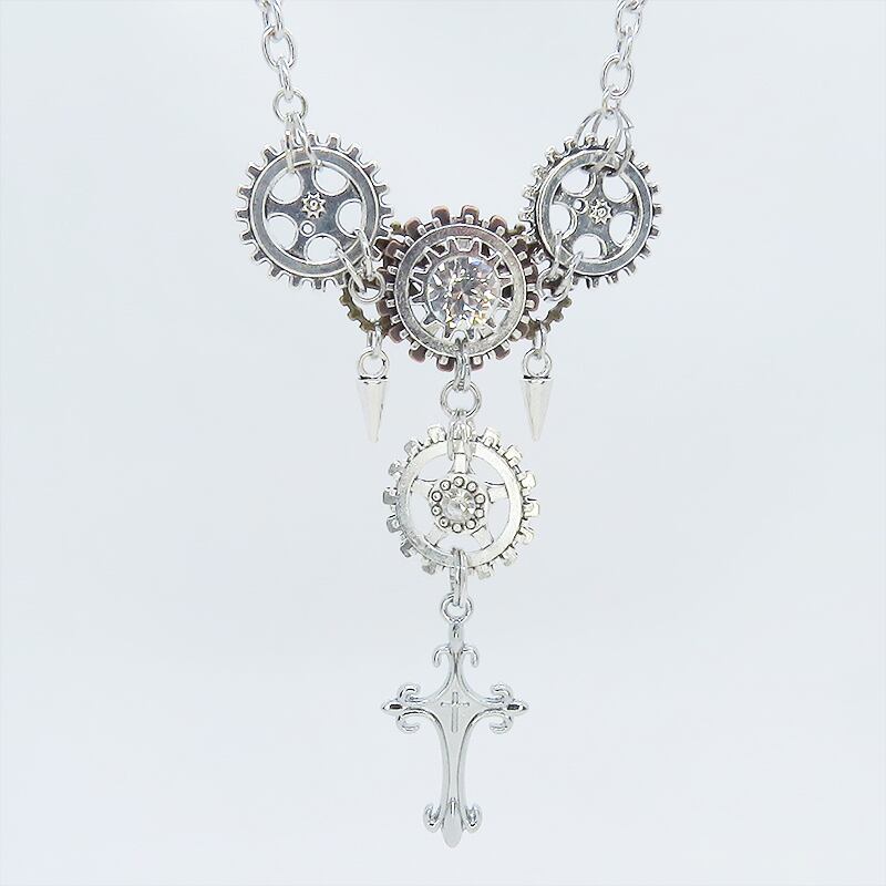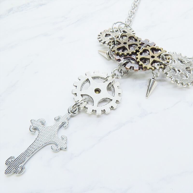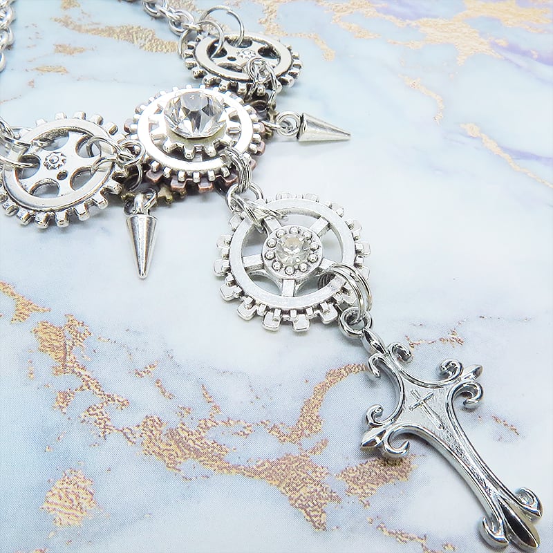 深みのあるアンティークシルバーカラーを基調とし、精密な機械仕掛けを思わせる歯車と、端正な装飾が施されたロザリオを巧みに組み合わせました