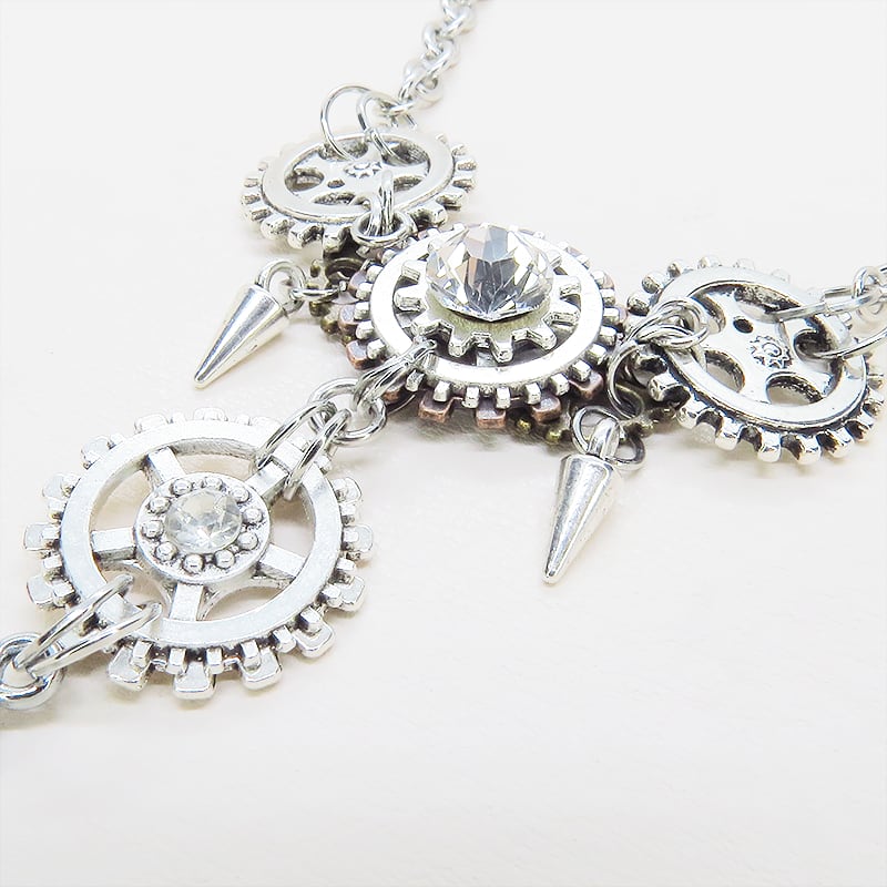 重厚なメタルの歯車の中に、クリアで力強い輝きを埋め込むことで胸元でひときわ眩い光を放ち、視線を惹きつけるポイントを作りました