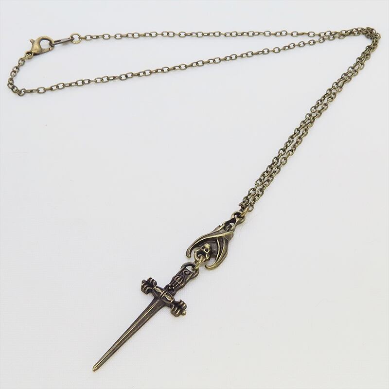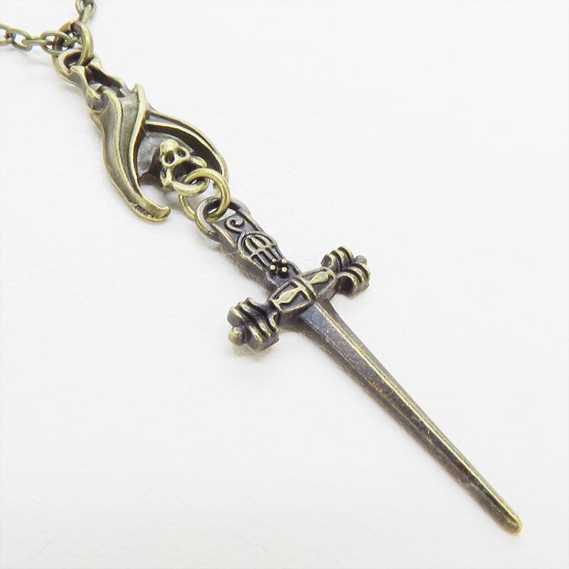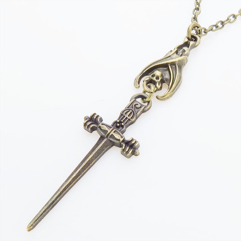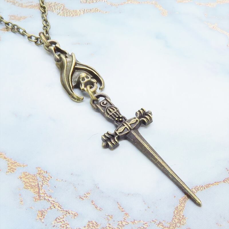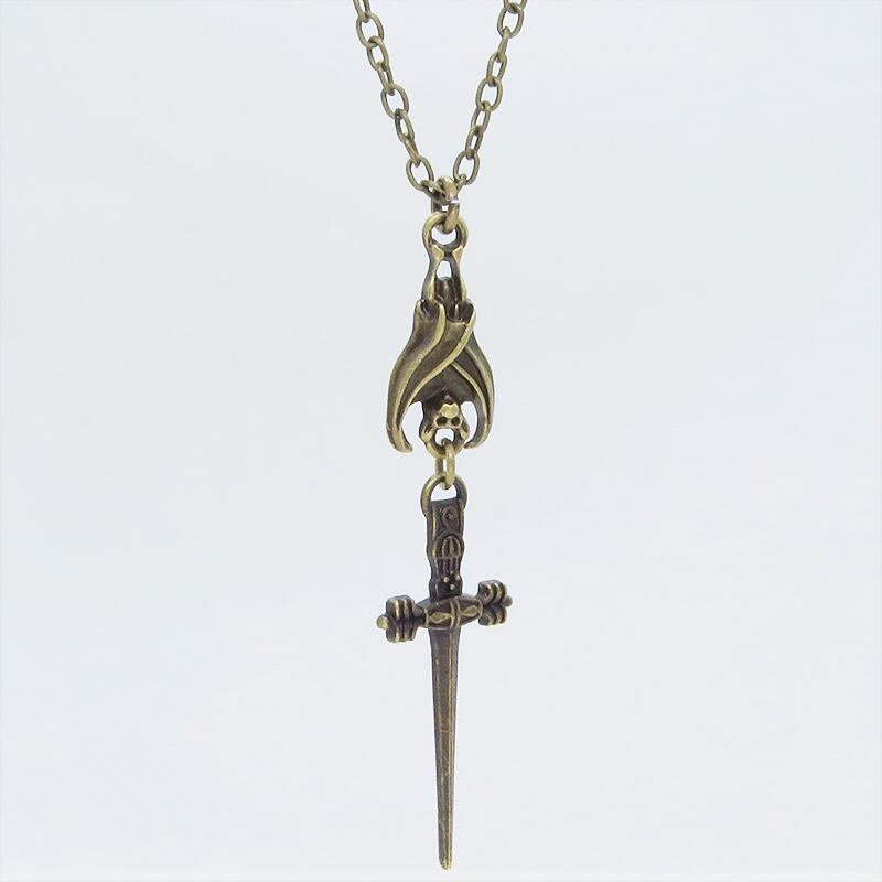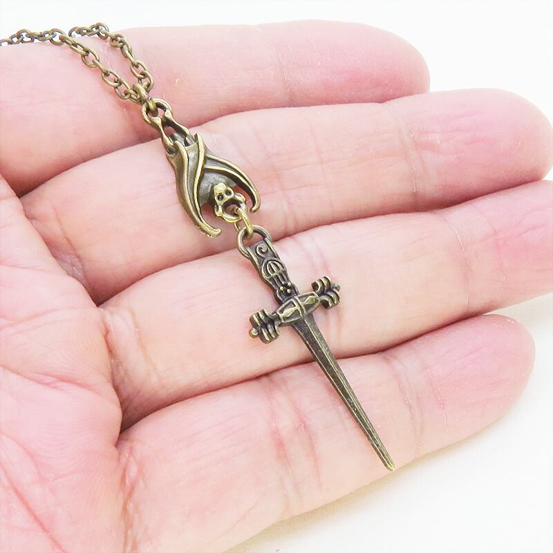 深みのあるアンティークゴールドカラーをまとい、夜の静寂を象徴するコウモリと、凛然としたソード(剣)を繋ぎ合わせたペンダントです